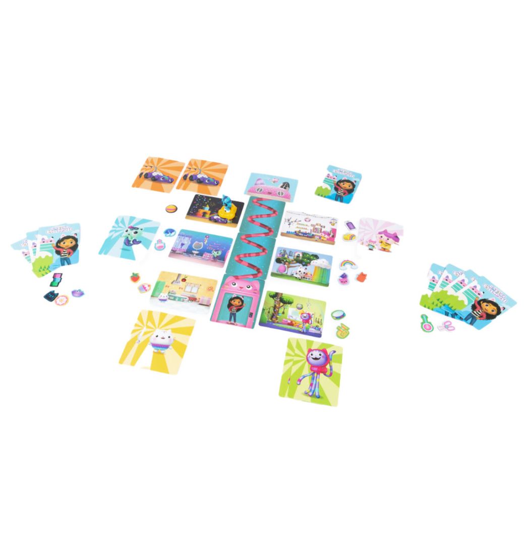 ¡Atención, fans de Gabby's Dollhouse! Con este alegre y colorido juego de cartas, los jugadores exploran la casa de muñecas y deben unir las cartas de los personajes con las cartas de la casa de muñecas. ¡Mantén la concentración y descubre los pares!.