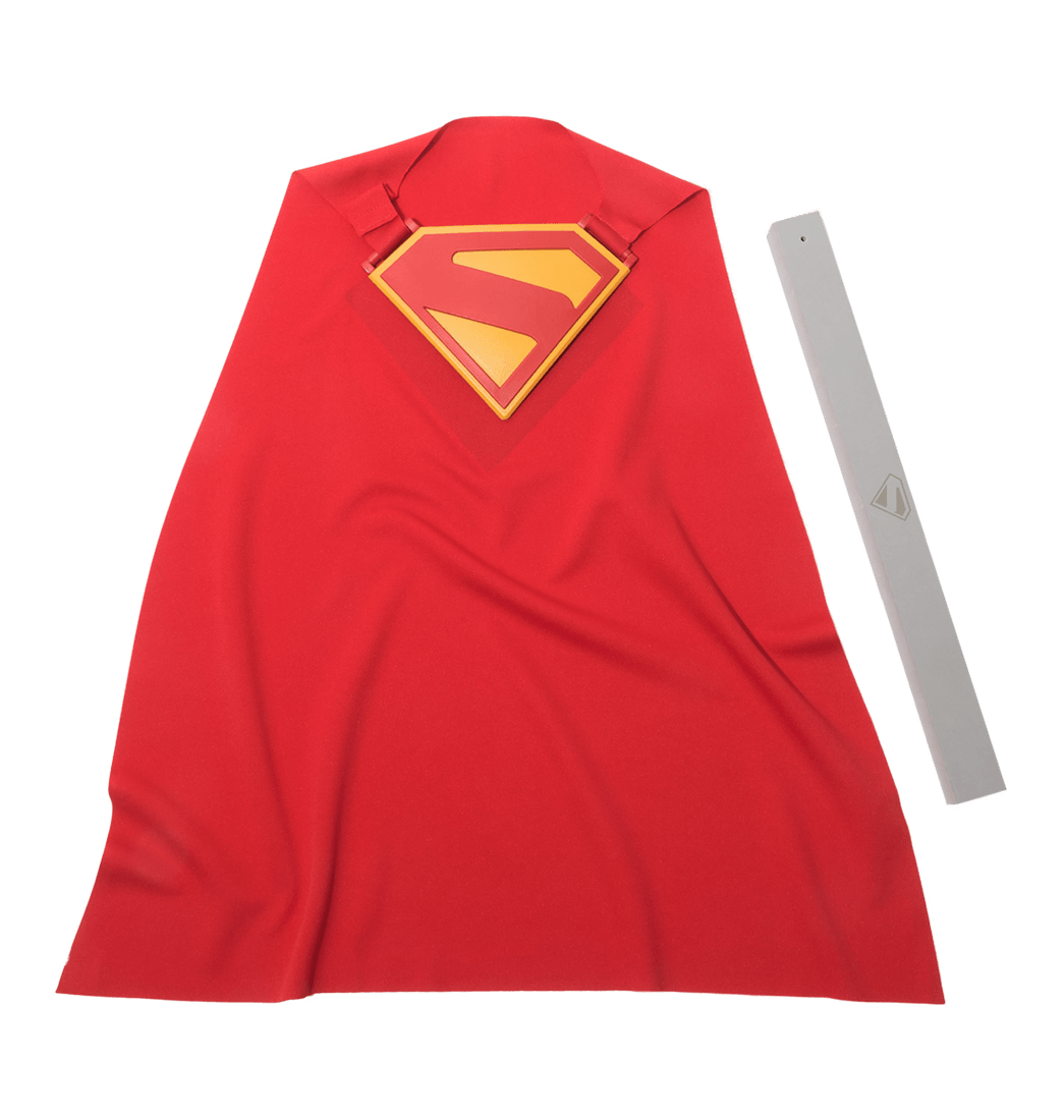 Incluye una capa con una placa de Superman en el pecho y una barra flexible.