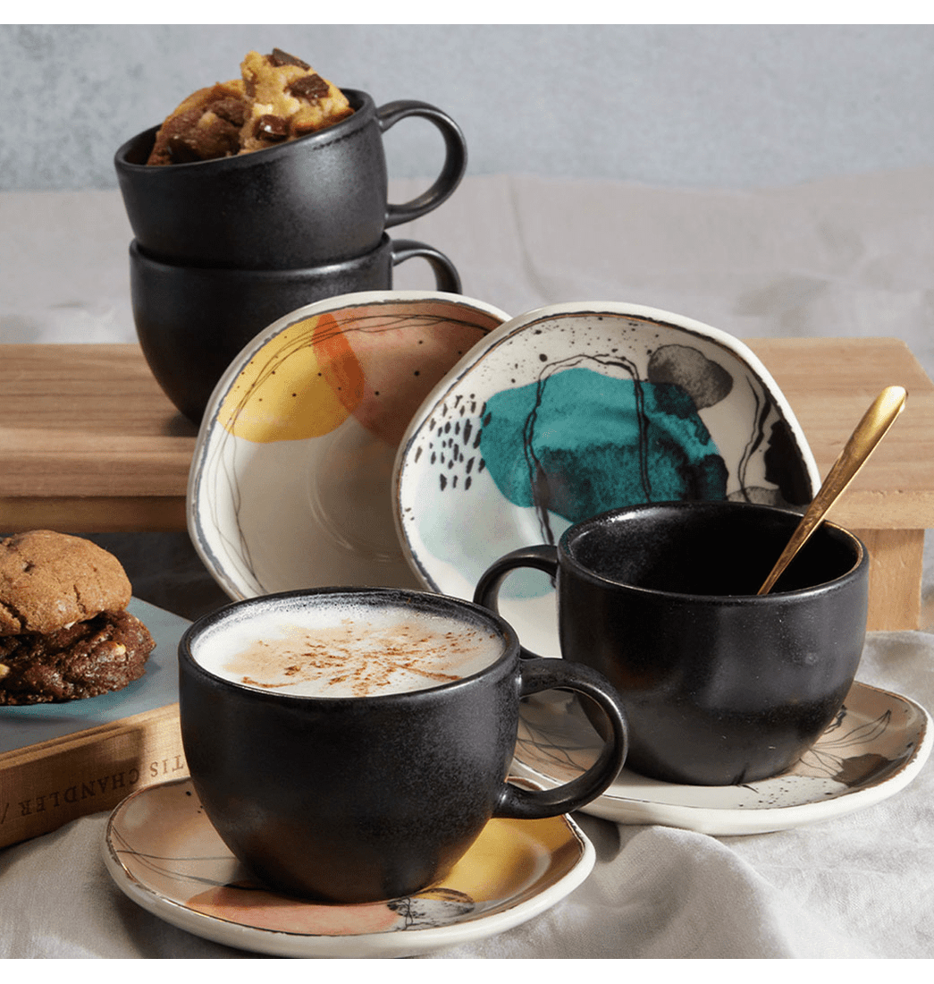 Este Juego de Te, cuenta con formas fluidas y orgánicas con una decoración de manchones de acuarela, hilos con curvas y pequeños jaspeados que logran a través de su representación una vajilla única y diferente. Además, tiene colores luminosos con transparencias que crean una conexión perfecta de inspiración para tu mesa. ¡Anímate y adquiérelo ahora!.