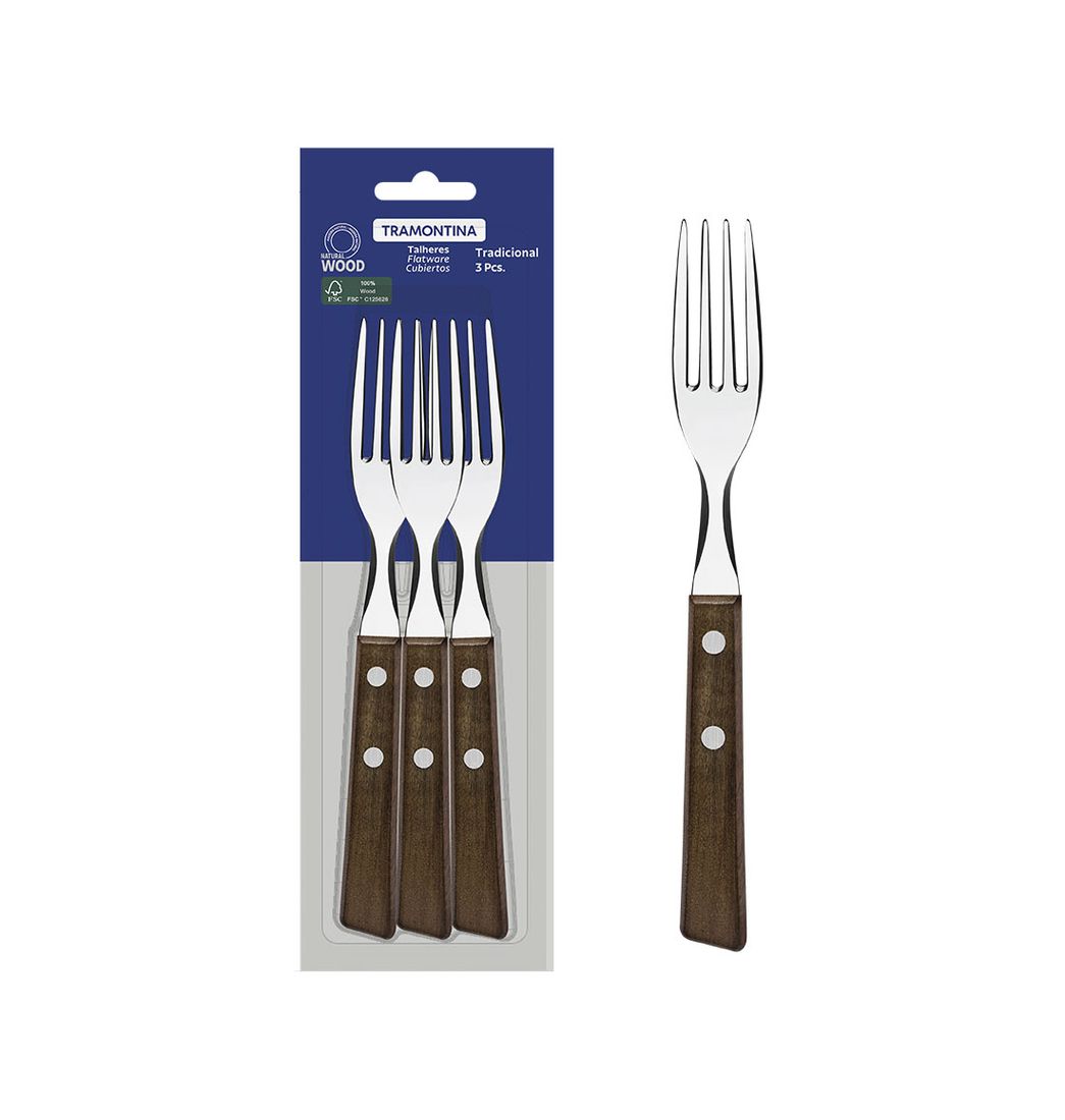 Juego de Tenedores de Mesa 3 Piezas Tradicional en Acero Inoxidable y Mangos Madera - Tramontina