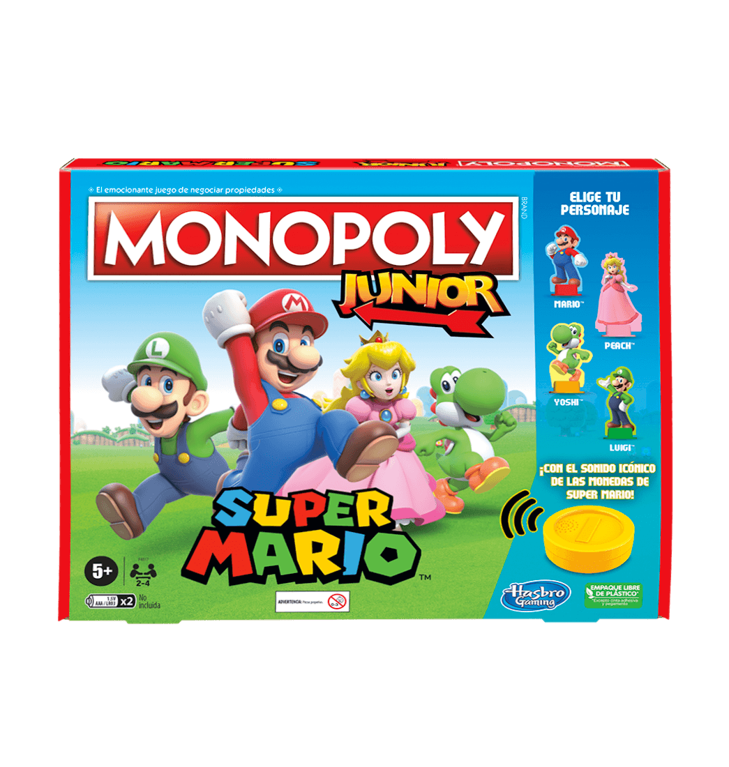 El juego Monopoly Junior se une con los personajes y temas de Super Mario para hacer un emocionante juego infantil. En el juego de mesa Monopoly Junior: Super Mario, los jugadores pueden imaginar que recorren el Reino Champiñón como Mario, Peach, Yoshi o Luigi, comprando propiedades y recolectando monedas. Los jugadores tiran el dado de poder para saber si pueden presionar la Moneda Sonora, que reproduce el sonido de moneda de Super Mario, y recolectar monedas. Este divertido juego es ideal como regalo de cumpleaños o de Navidad para fans de Super Mario. Comparte junto a tus hijos hermosos momentos en familia con este juego de mesa y ¡Anímate a llevarlo ahora!