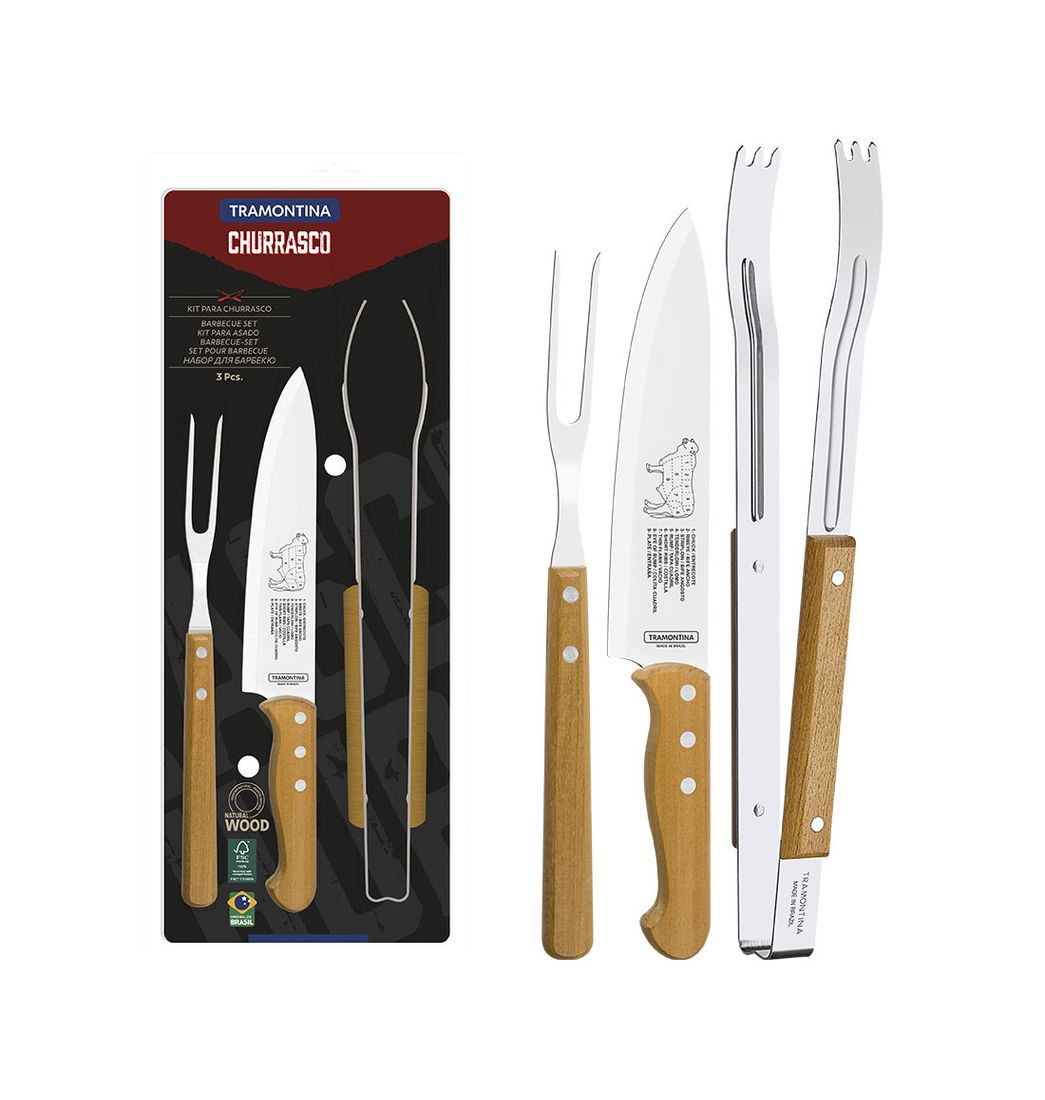 Juego para Asado 3 Piezas Churrasco en Acero Inoxidable y Mangos Madera - Tramontina