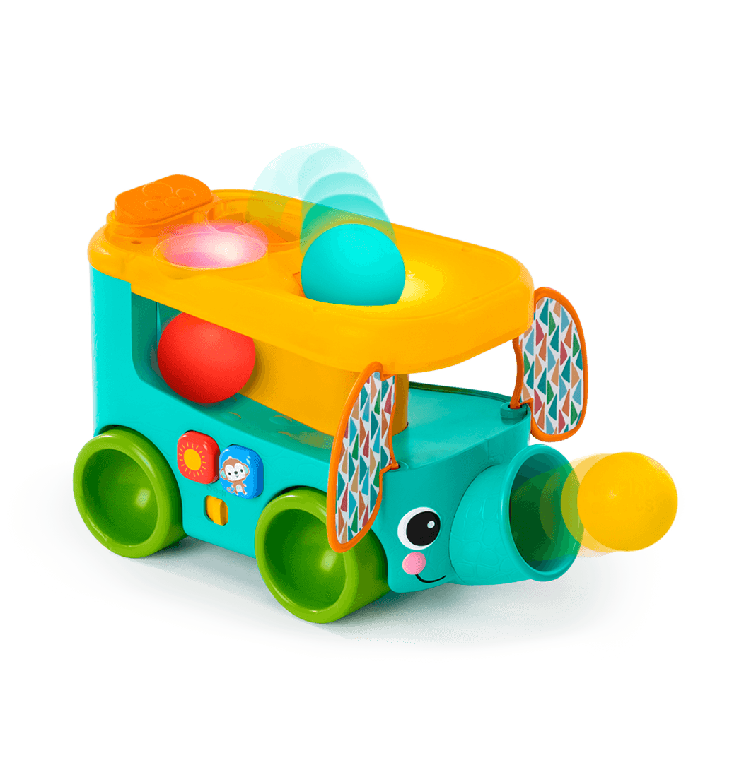 Fomenta las habilidades motoras finas y diviértete junto a tu pequeño jugando con la pelota en el autobús safari Pop & Roll de Bright Starts. Los bebés podrán dejar caer o lanzar las pelotas en los dos agujeros superiores o sacarlas de la trompa del elefante.