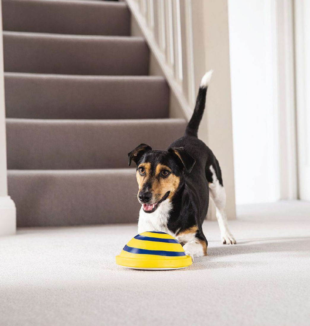 Con este Juguete tu mascota se entretendrá por más tiempo manteniéndose activo y ejercitándose, ya que su forma de media bola se desliza sobre suelos duros y alfombras el cual le dará una mayor diversión a tu perro. Cuenta con base plana que evita rebotar para proteger tus muebles y objetos, además tiene parachoques de goma que no raya ni marca las paredes, sonido incorporado y diseño que alienta a tu perrito a perseguir, empujar y abalanzarse ¡Anímate y adquiérelo ahora!
