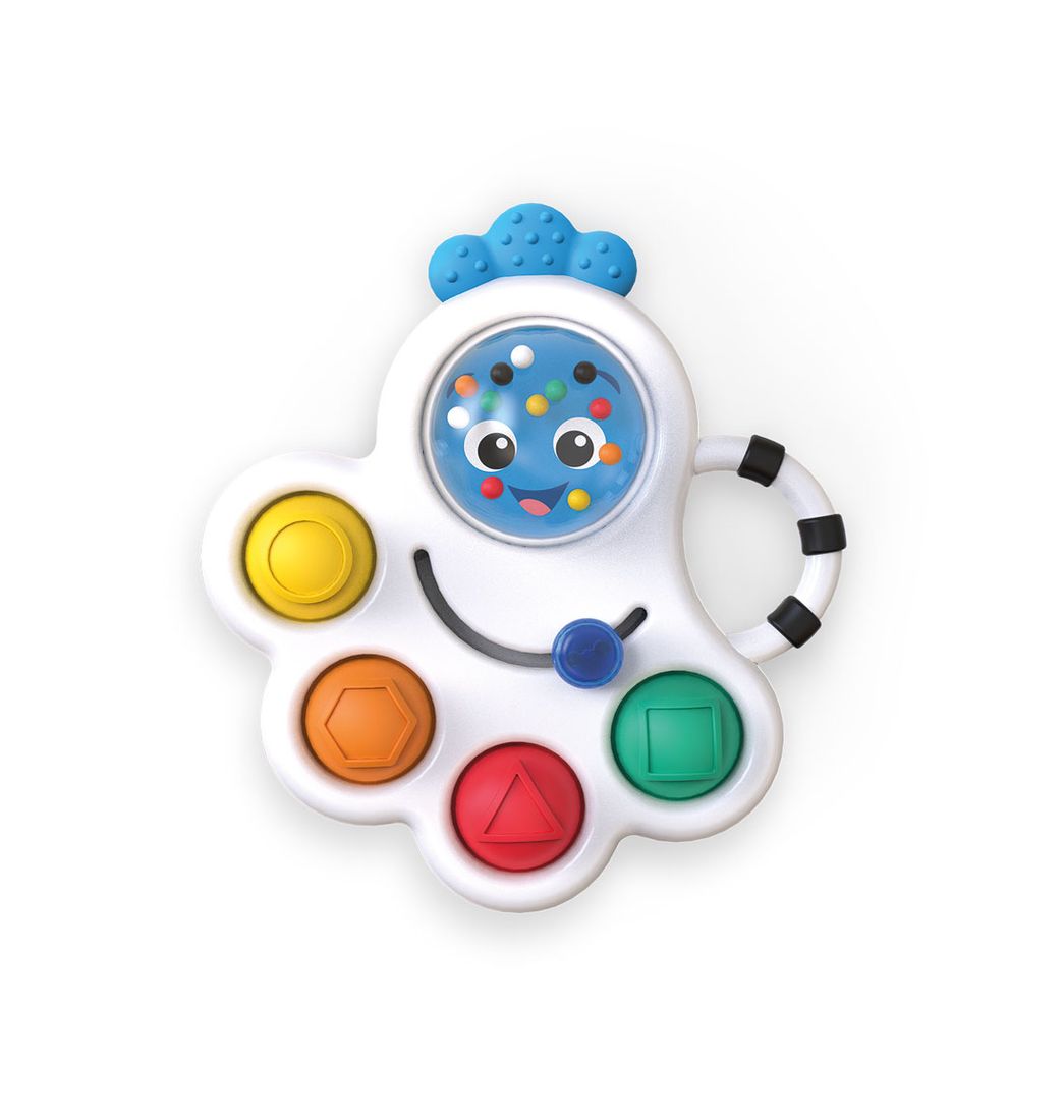 Con un diseño 3 en 1, Shape Pops de Opus es un mordedor, sonajero y juguete sensorial que seguramente captará y mantendrá la atención de tu pequeño. Sus puntos de burbujas suaves y vibrantes son muy divertidos para que el bebé los empuje y presione porque lo recompensan con un suave sonido de pop. Opus el pulpo es un personaje popular de los libros y videos de Baby Einstein.