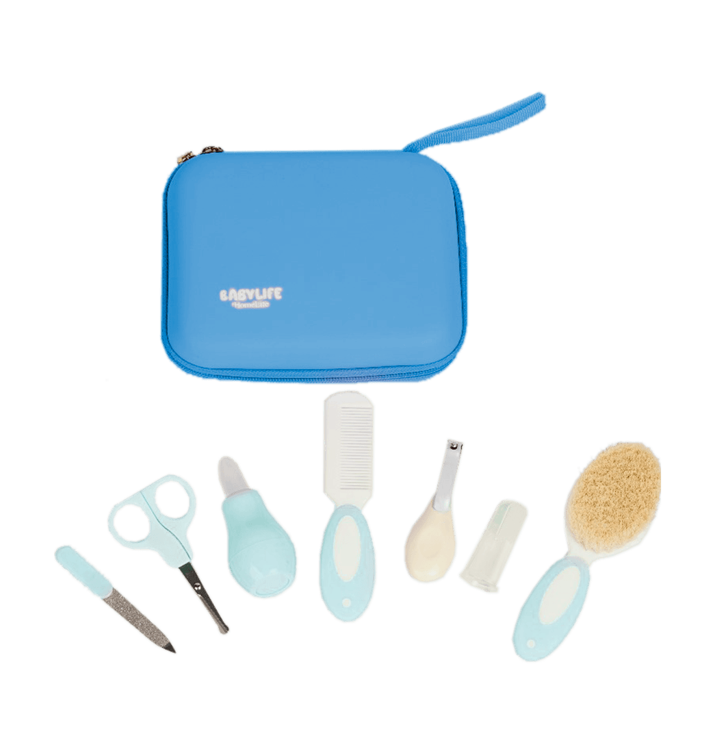 Incluye: Lima de uñas para bebé, cortaúñas para bebé, cepillo para el cabello (el cepillo limpia lengua y dientes), aspirador nasal, peine para bebé, tijeras para bebés, y estuche rígido para guardar los accesorios.