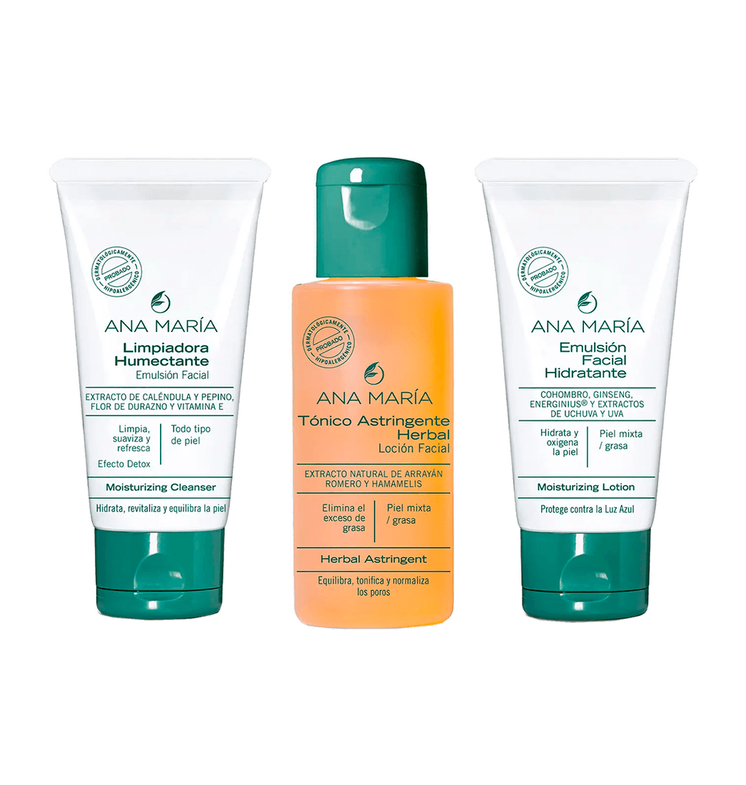 Incluye: Limpiadora Humectante 30g, tónico astringente herbal 60 ml, emulsión facial hidratante 30 gr.