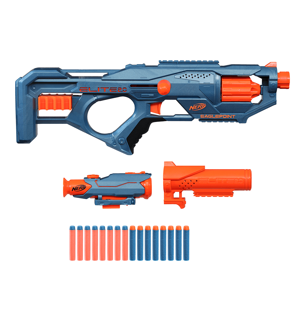 Personaliza el lanzador Nerf Elite 2.0 Eaglepoint RD-8 para cualquier misión. Incluye una mira y un cañón desmontable para que puedas crear diferentes estilos mientras te preparas para las batallas Nerf. Ataca ligero con el lanzador de base, añade la mira para alinear tus objetivos o añade el cañón para apuntar a distancia... con el lanzador Eaglepoint RD-8 estás listo para lo que te depare la batalla. El tambor giratorio tiene capacidad de 8 dardos. Lanza 8 dardos seguidos y luego recarga rápido con el portadardos integrado. Viene con 16 dardos Nerf Elite oficiales, 8 dardos para cargar en el tambor y 8 dardos para guardar en el lanzador. Apunta y envía los dardos por los aires hasta 27 metros. ¡Anímate y llévalo ahora!