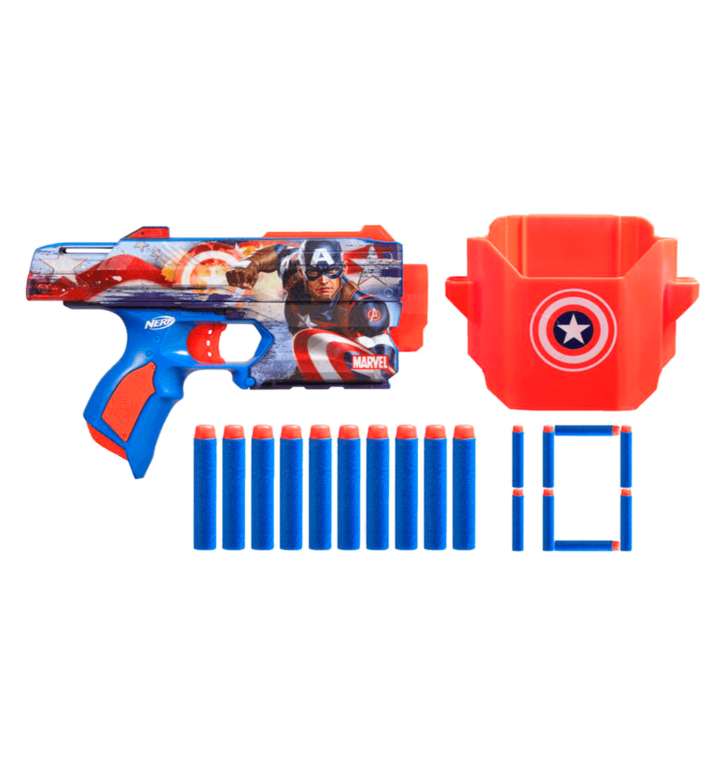 Viene con 10 dardos Nerf Elite para múltiples recargas. Incluye una funda con clip con decorado de Capitán América, lo que te permite mantener el lanzador a la mano para lanzarte a batallas Nerf bajo techo o al aire libre.