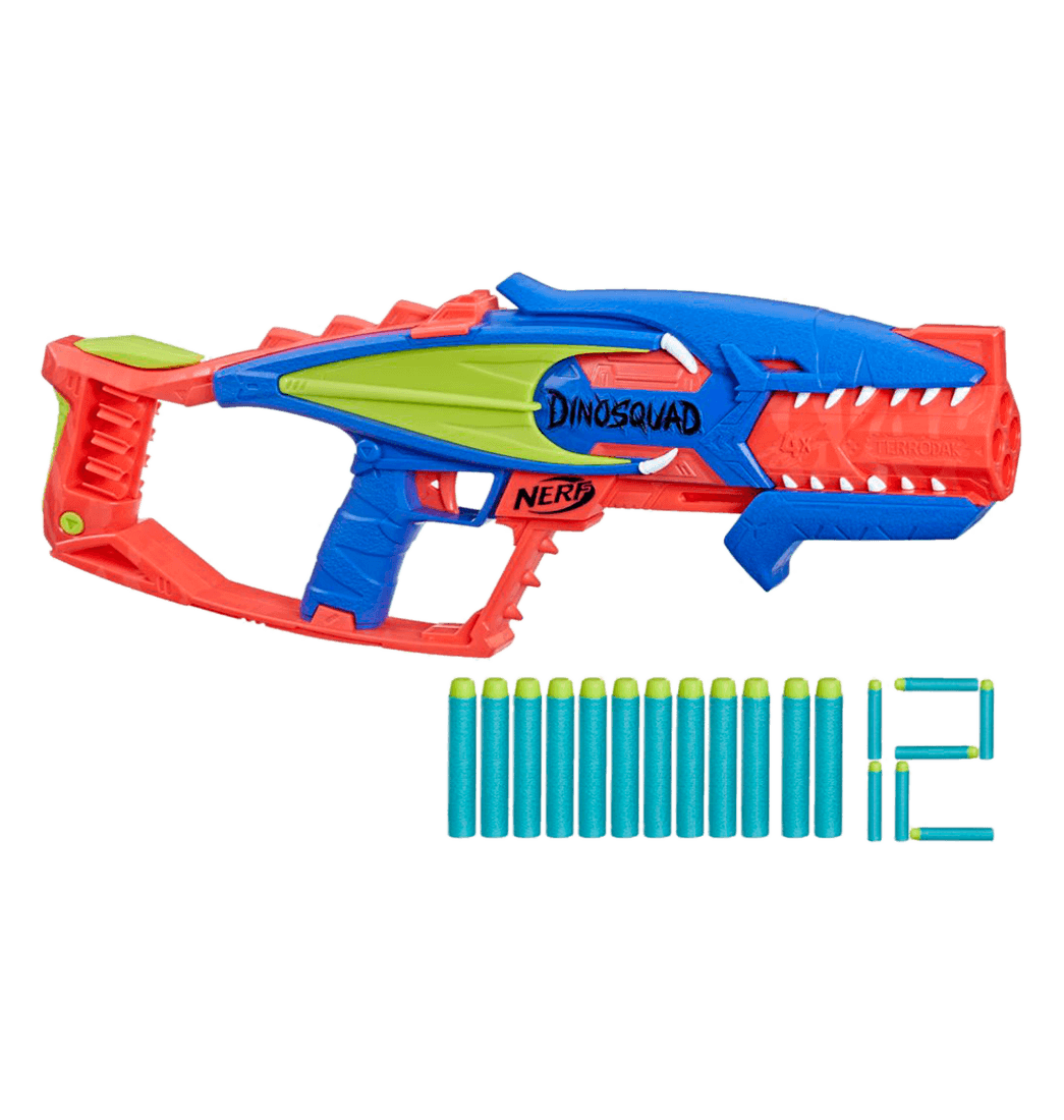 Los niños están preparados para juegos al aire libre con el lanzador Nerf DinoSquad Terrodak que cuenta con un fantástico diseño de dinosaurio que representa la apariencia de un pterodáctilo. El juguete lanzador de dardos de espuma tiene un cañón con capacidad para 4 dardos y los lanza uno a la vez.
