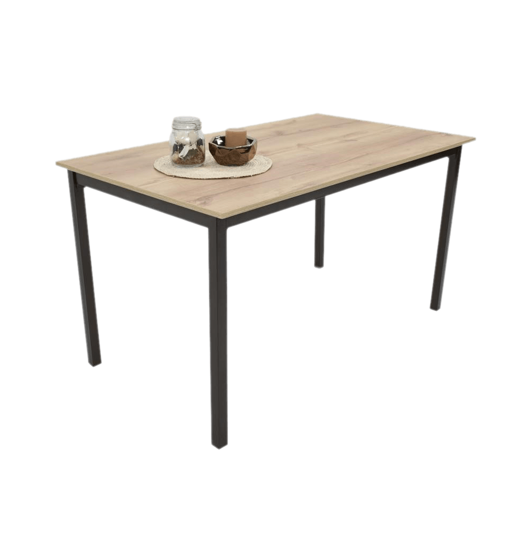 - La Mesa de Comedor Orion se encuentra fabricada en una fuerte estructura metálica con acabado en pintura electrostática tono cobre martillado y una superficie madera aglomerada de 22mm color Duna.