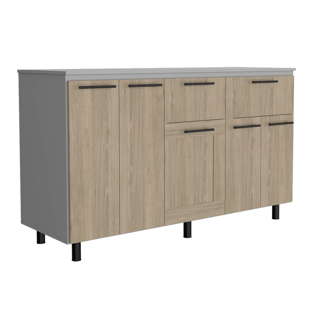 Complementa tu cocina con este práctico y lindo Mueble inferior, el cual sirve para mesón derecho o izquierdo, además cuenta con cinco puertas batientes, dos cajones, manijas y patas metálicas. No incluye mesón.