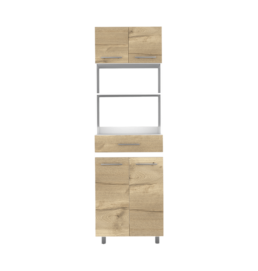 El Módulo para Microondas trae diseño con cuatro puertas batientes, un cajón organizador y manijas metálicas, este mueble tiene un estilo moderno y elegante.
