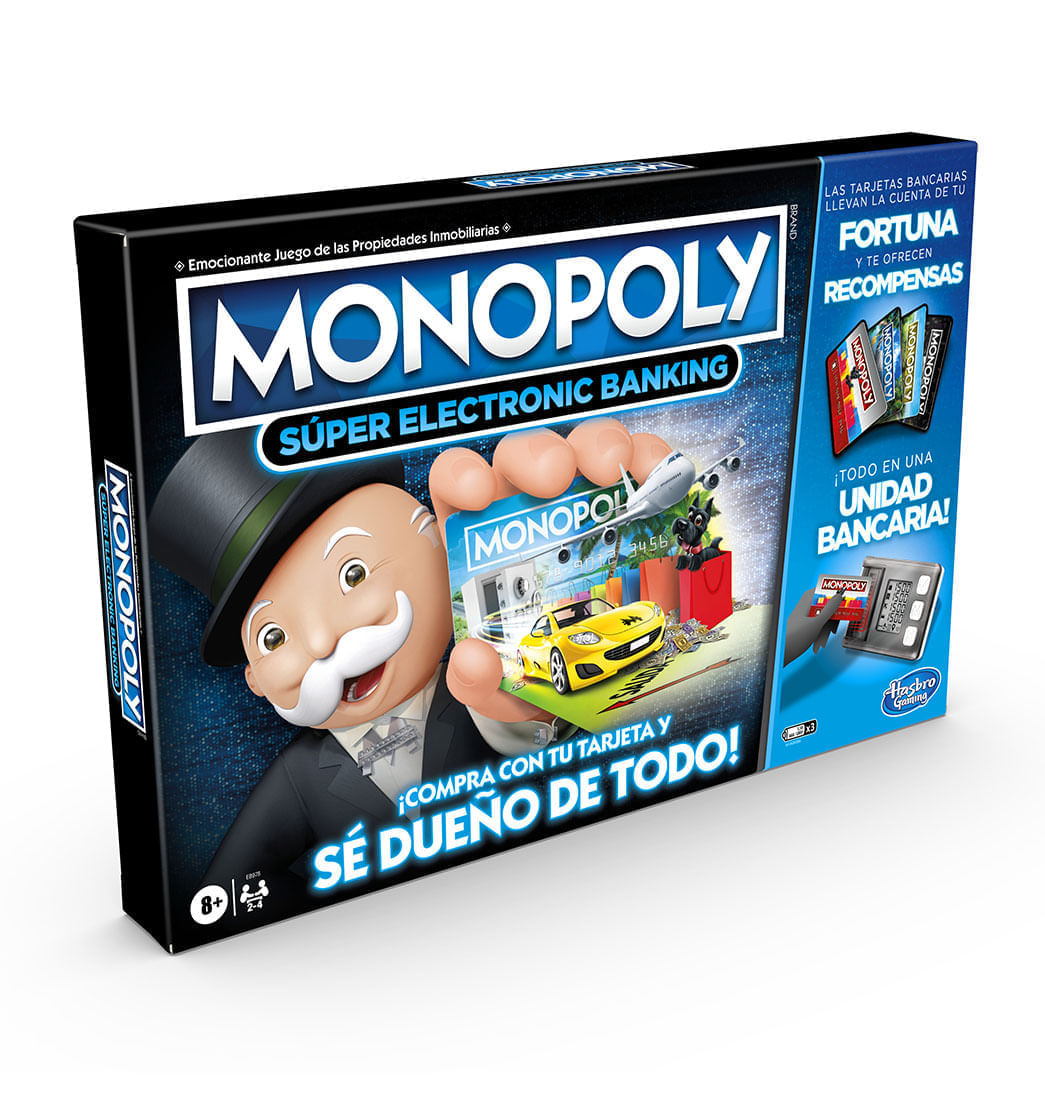 El juego Monopoly Súper Banco Electronico incluye una unidad bancaria electrónica multifuncional y recompensas únicas que aumentan la diversión. Cada jugador elige una tarjeta bancaria que lo recompensa al llevar a cabo acciones como sacar un determinado número en los dados, caer en una determinada casilla o comprar una determinada propiedad. Los jugadores pueden volar hacia una propiedad del tablero y forzar a otro jugador a intercambiar una de sus codiciadas propiedades. Además, no hay dinero en efectivo: las tarjetas y la unidad bancaria llevan la cuenta del dinero de cada jugador. Es un emocionante juego en el que los jugadores compran propiedades, cobran rentas y ¡reciben recompensas! Gana el jugador que tenga más dinero al final de la partida.