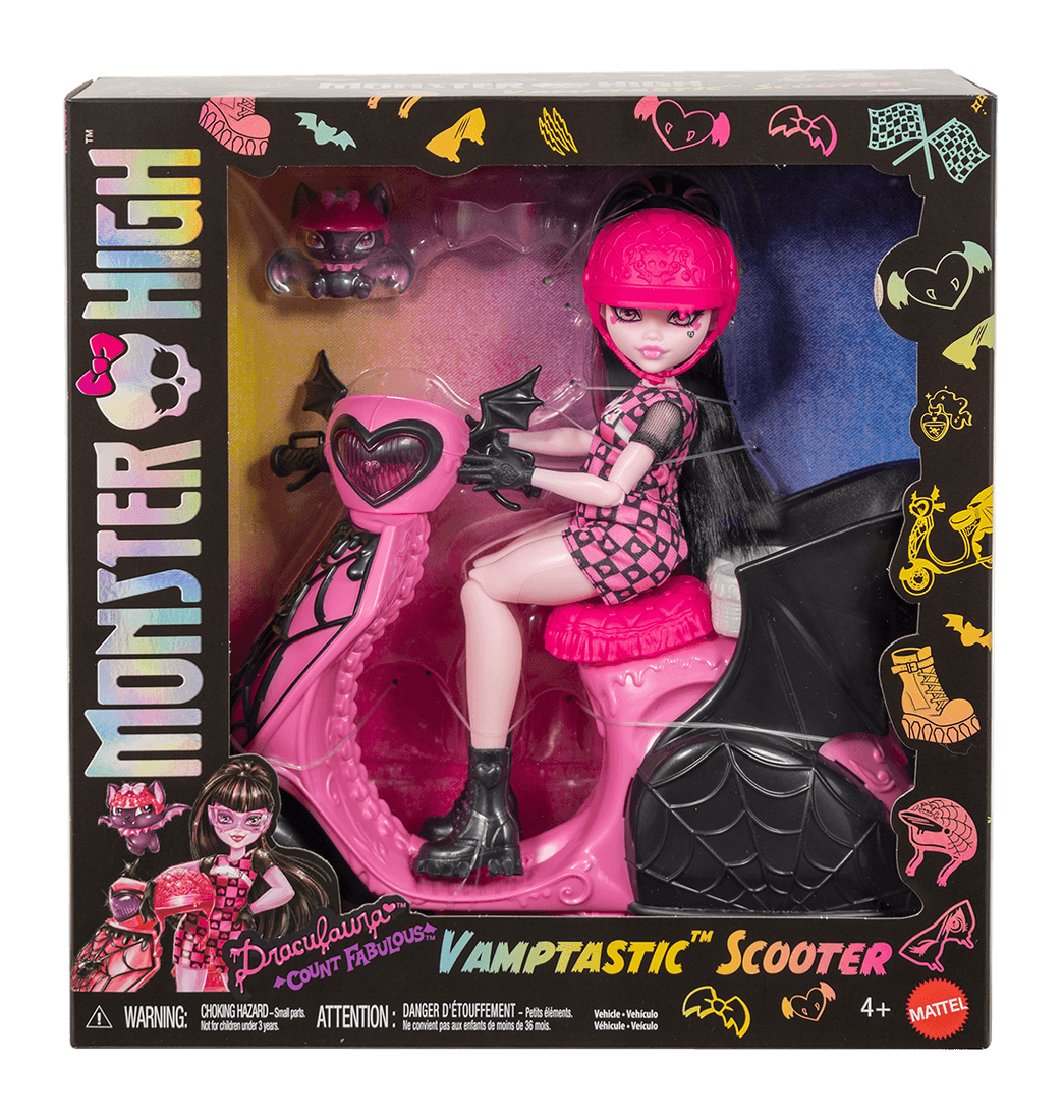 El reloj ha dado la medianoche en Monster High, y Draculaura está lista para la aventura con su vampírico scooter y su adorable murciélago mascota, el Conde Fabuloso. ¡Incluso tienen cascos a juego!