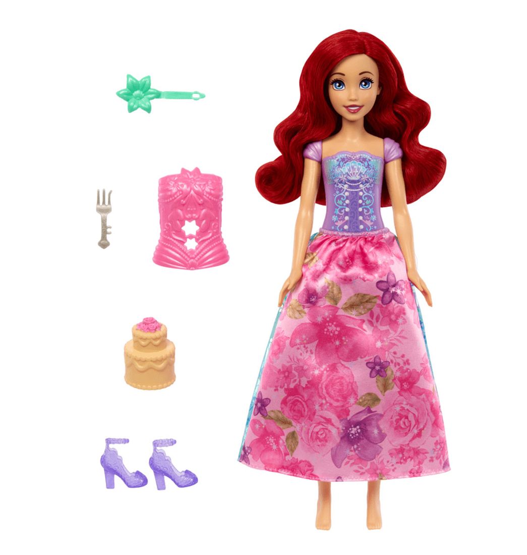 La revelación final es una muñeca de Ariel con un precioso atuendo floral. La falda reversible y el corpiño aumentan la diversión, permitiendo que los niños y las niñas jueguen e imaginen miles de historias con este set.