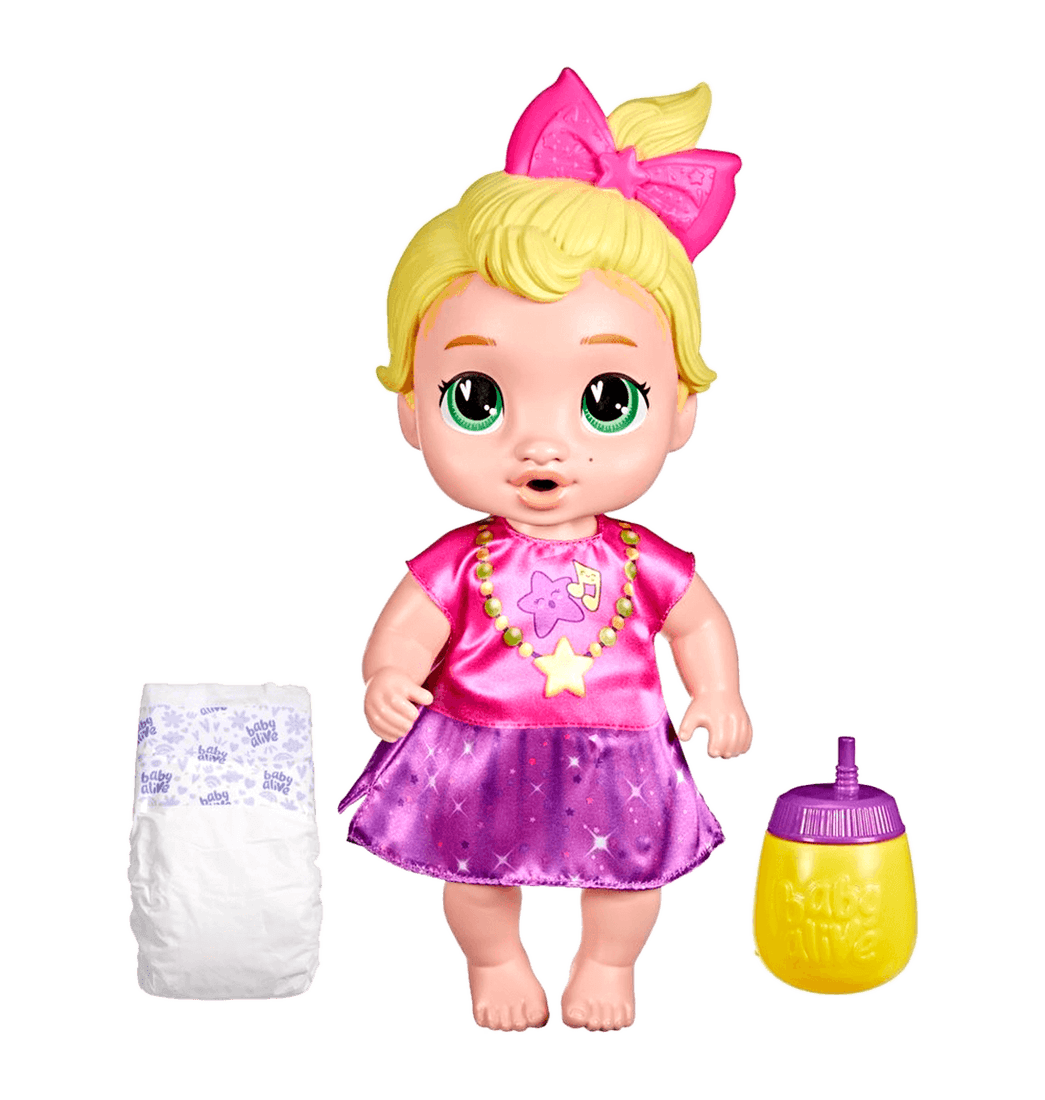 ¡Explora el juego de cuidar y alimentar con el set de muñeca bebé LaLa GooGoo de Baby Alive Bebé Sorbitos! Imagina que cuidas a una muñeca amiga con esta muñeca que bebe y moja el pañal. Llena de agua el biberón de LaLa GooGoo para que ella pueda beberla. Después, es la hora de cambiarle el pañal y ponerle el pañal de muñeca bebé incluido.