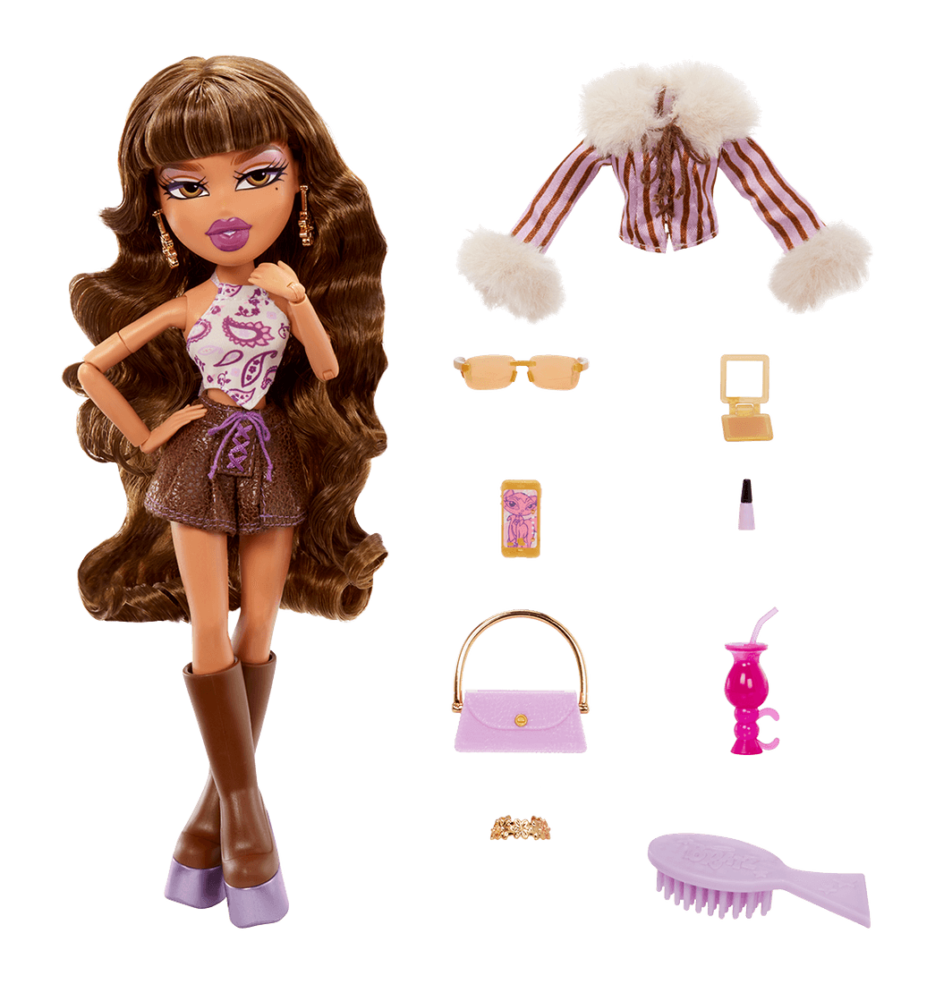 Incluye: muñeca de moda Bratz con atuendo, lentes de sol, teléfono, aretes, collar, compacto, esmalte de uñas, taza de batido, bolso, cepillo para el cabello y póster.