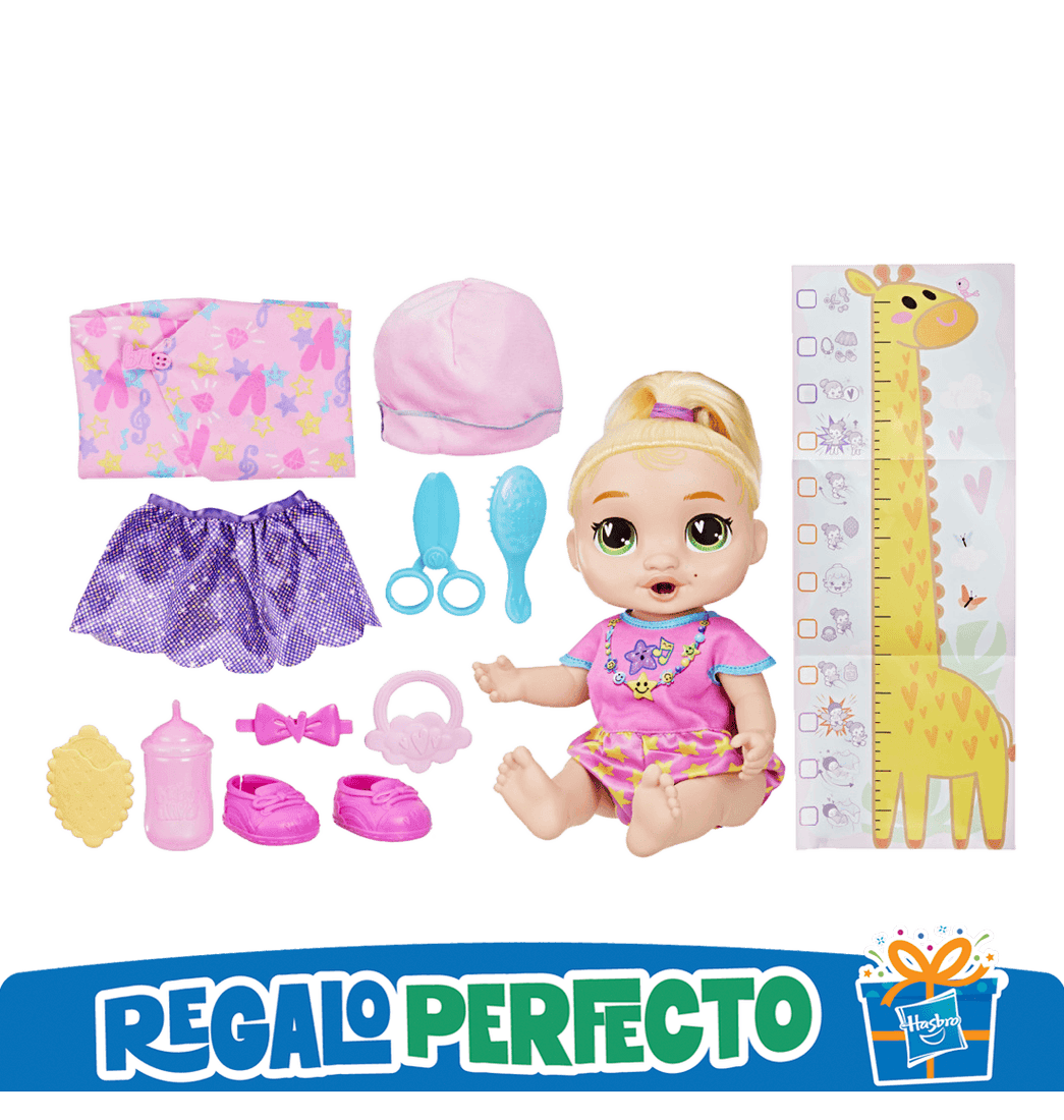 Incluye muñeca, envoltura, gorro, falda, par de zapatos, broche para el cabello, biberón, chupete, cepillo, galleta, tijera de juguete y tabla de crecimiento.