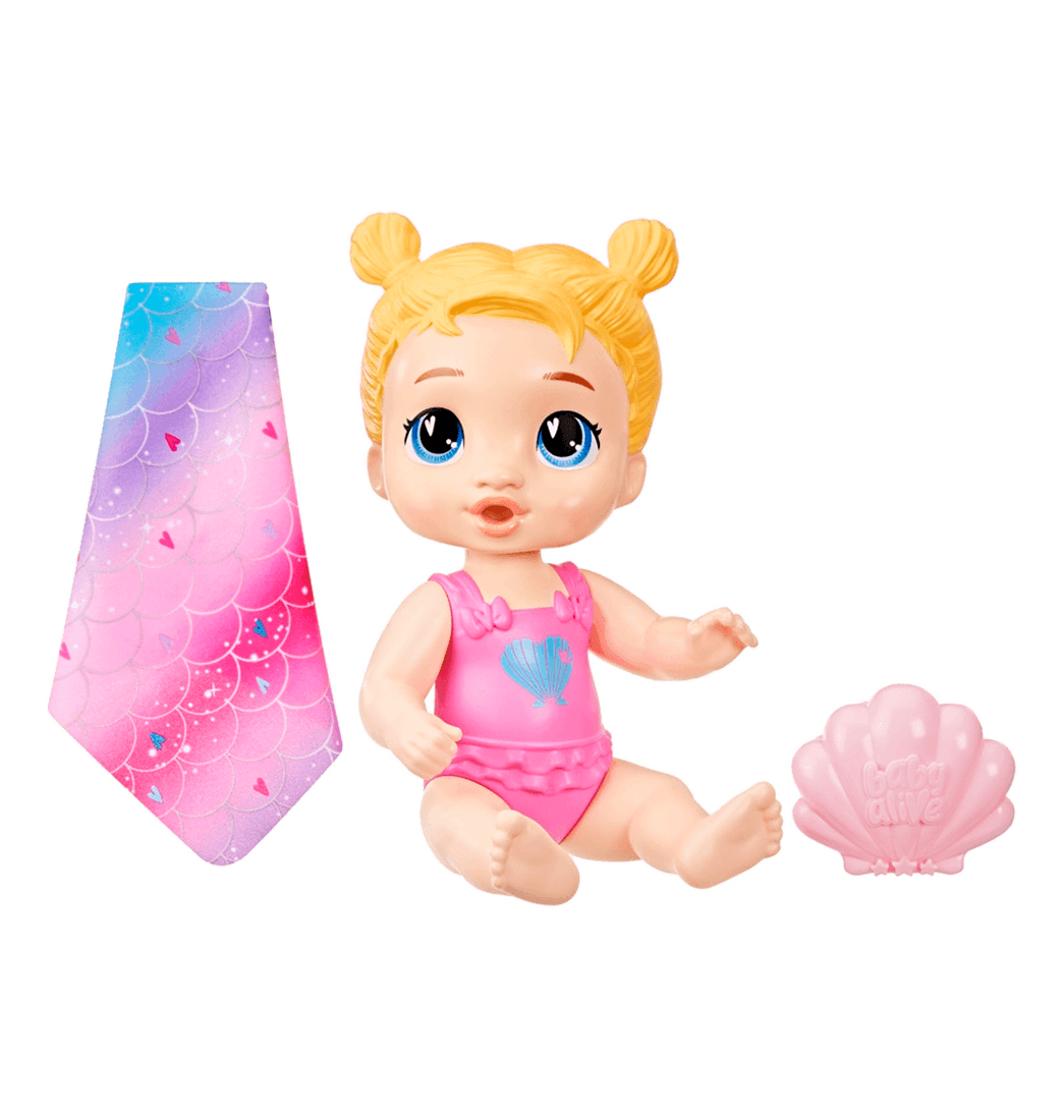 Es la hora de nadar con la muñeca acuática Harper Hugs Chapuzón de sirena de Baby Alive. Juega a bañarla y después sécala con la toalla de juguete incluida, la cual tiene un diseño de sirena, para que siga la diversión fuera del agua.