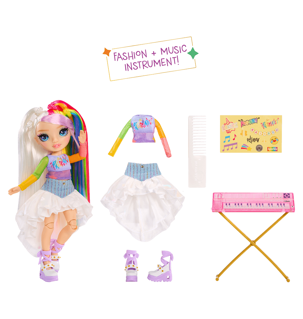 Cada muñeca de moda de Rainbow High inspira a niños y niñas a ser creativos. Cada una de estas lindas muñecas Rockband Fashion viene con su propio instrumento y pegatinas para darle un toque personalizado.