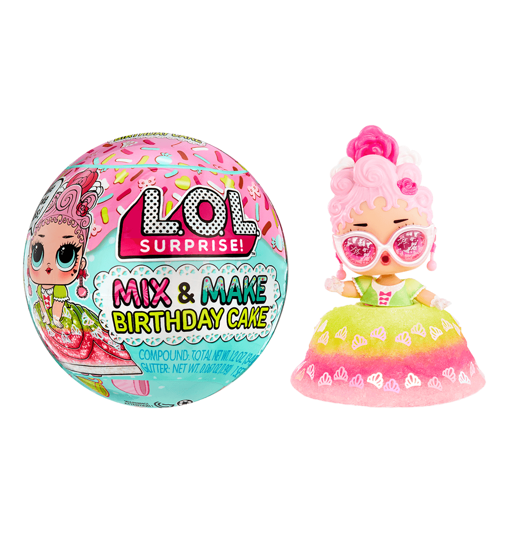 Crea tu propio vestido de pastel de cumpleaños con las nuevas L.O.L. Surprise Mix & Make Birthday Cake! Con tres mezclas, purpurina decorativa y un molde de vestido. Simplemente vierte los ingredientes, añade agua, deja reposar y decora para hacer un vestido colorido y brillante para tu muñeca.