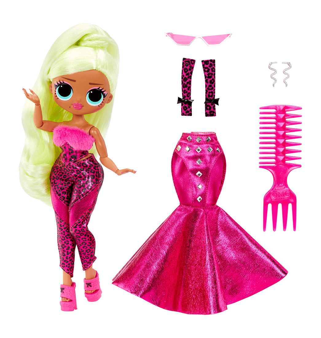 Te presentamos a Lady Diva, dale un micrófono y prepárate para bailar. Es la hermana mayor de la favorita de los fanáticos de L.O.L. Surprise, la fabulosa Diva. Desempaca sorpresas con L.O.L. Surprise O.M.G. Muñeca de moda, con estampas impresionantes, cabello peinado y articulada para toneladas de poses. Viste a Lady Diva con sus modas más feroces y accesorios fabulosos para mostrar su propio estilo de diva pop espectacular.