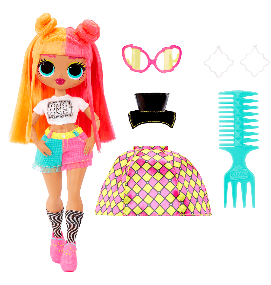 Te presentamos a Neonlicious, es la hermana mayor del favorito de los fanáticos de L.O.L. Surprise, Neón Q.T. . Desempaca sorpresas con L.O.L. Surprise O.M.G. Muñeca de moda, con estampas impresionantes, cabello peinado y articulada para toneladas de poses. Viste a Neonlicious con sus modas más neones y accesorios fabulosos.