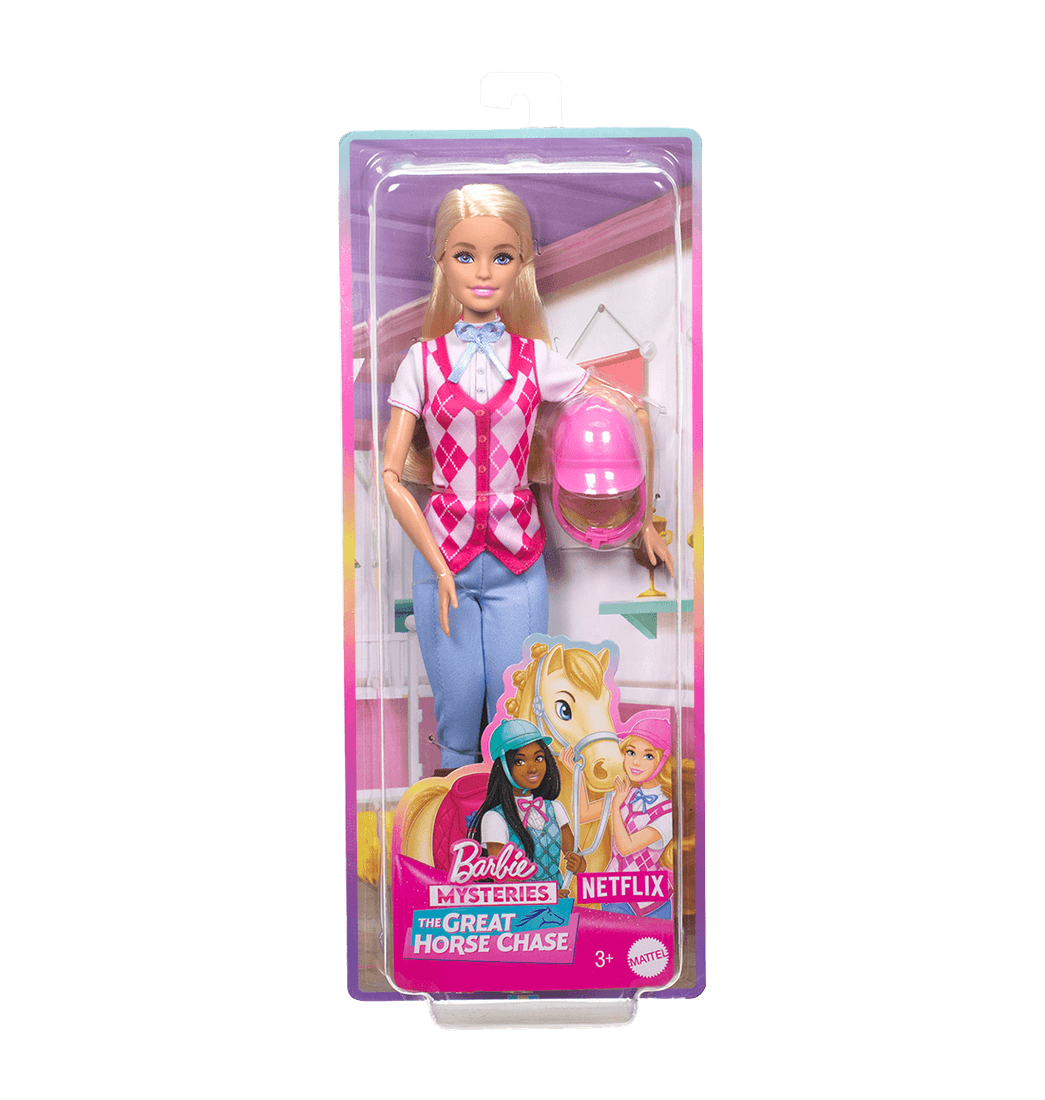 ¡La muñeca Barbie Malibu está lista para vivir aventuras a caballo! Con un elegante conjunto de equitación, se parece a su personaje de la serie de Netflix, Barbie Misterios: La Gran Persecución a Caballo. La muñeca Barbie lleva una camisa y un chaleco desmontable, pantalones, botas y casco, ¡y se dobla por los codos, las muñecas y las rodillas para un juego de equitación realista!
