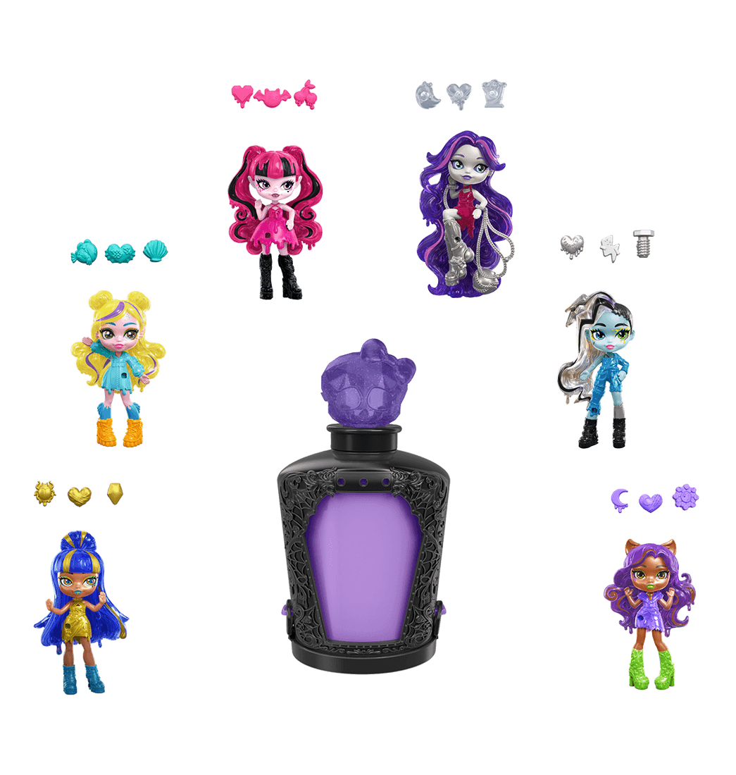 ¡Regala un personaje de miedo con las Pociones Hechizantes de Monster High! Solo tienes que mezclar la poción para obtener una espeluznante sorpresa. Cada frasco embrujado viene con una figurita de 3 pulgadas de un personaje favorito de los fans de Monster High, ¡así como tres amuletos mágicos