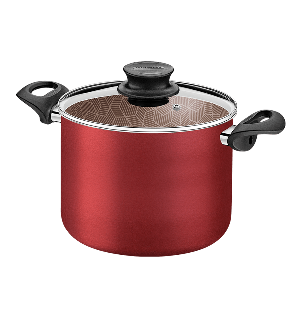 Sin duda, no se quedará sin alimentos durante su comida, con la olla alta de aluminio de Tramontina con revestimiento interior y exterior antiadherente rojo Starflon Max junto con la tapa de vidrio de 20 cm y 4,2 litros.