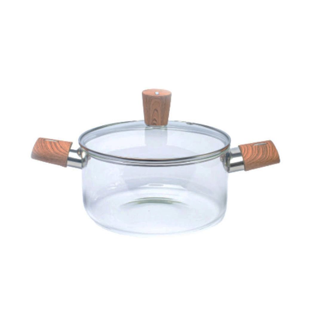 Su tapa ajustada asegura una cocción uniforme, mientras que el mango de madera proporciona un agarre cómodo y seguro. Esta Olla de Vidrio es ideal para preparar una variedad de platos y es perfecta para quienes buscan calidad y estética en su cocina.