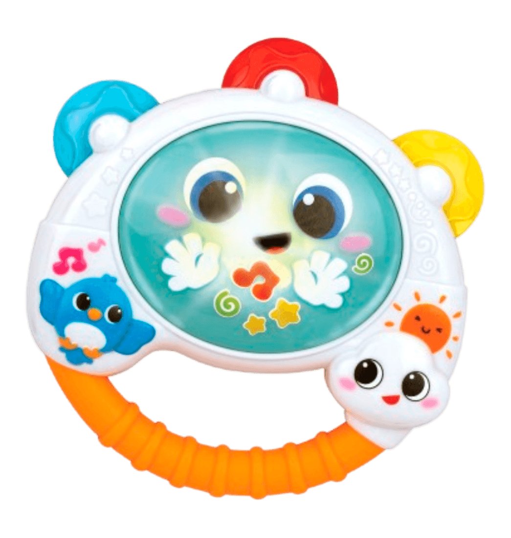 Esta linda y llamativaPandereta está diseñada para un fácil agarre en las manos pequeñas de tu bebé. Su diseño brillante y colorido les encantara a los más pequeños de casa. Presiona para escuchar sonidos divertidos y melodías con luz intermitente. Agita para escuchar sonidos de pájaros y de cascabeles.