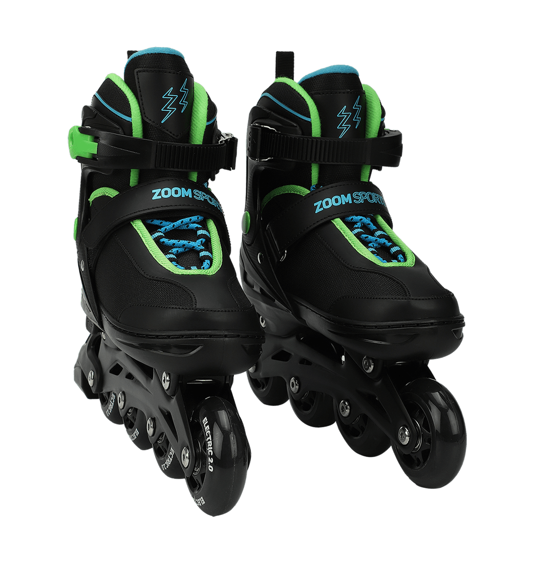 Los patines Electric de ZOOM están especialmente diseñados para patinadores eventuales que se están iniciando en el deporte por esto sus ruedas en PU con ABEC7; su bota es semiblanda, acolchado en espuma y refuerzo en material sintético; es ajustable a 4 tallas lo que prolonga su uso, Botón de ajuste de talla, base en pasta PVC., correa ajustable de material sintético con velcro y cordones, su chasís en alumnio lo hace más ligero, maniobrable y transmite mejor la sensación al patinar.