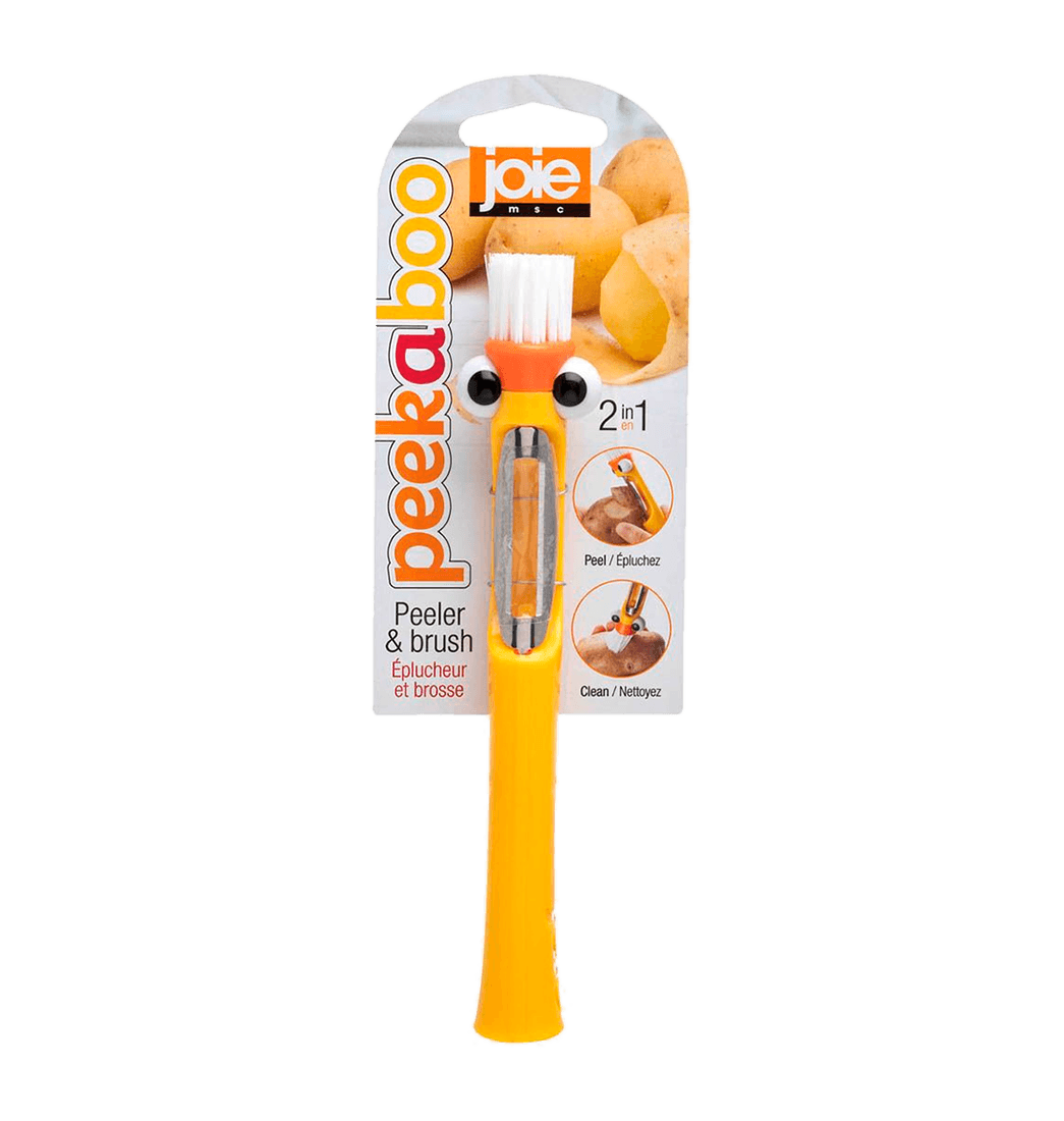 El cepillo pelador Peekaboo de Joie limpia y pela la piel de las frutos o tubérculos para facilitar la preparación de los alimentos. Fabricado en acero inoxidable 18/8, plástico y nailon; sin BPA; resistente, duradero, este pelador no se desafila ni necesita afilarse.