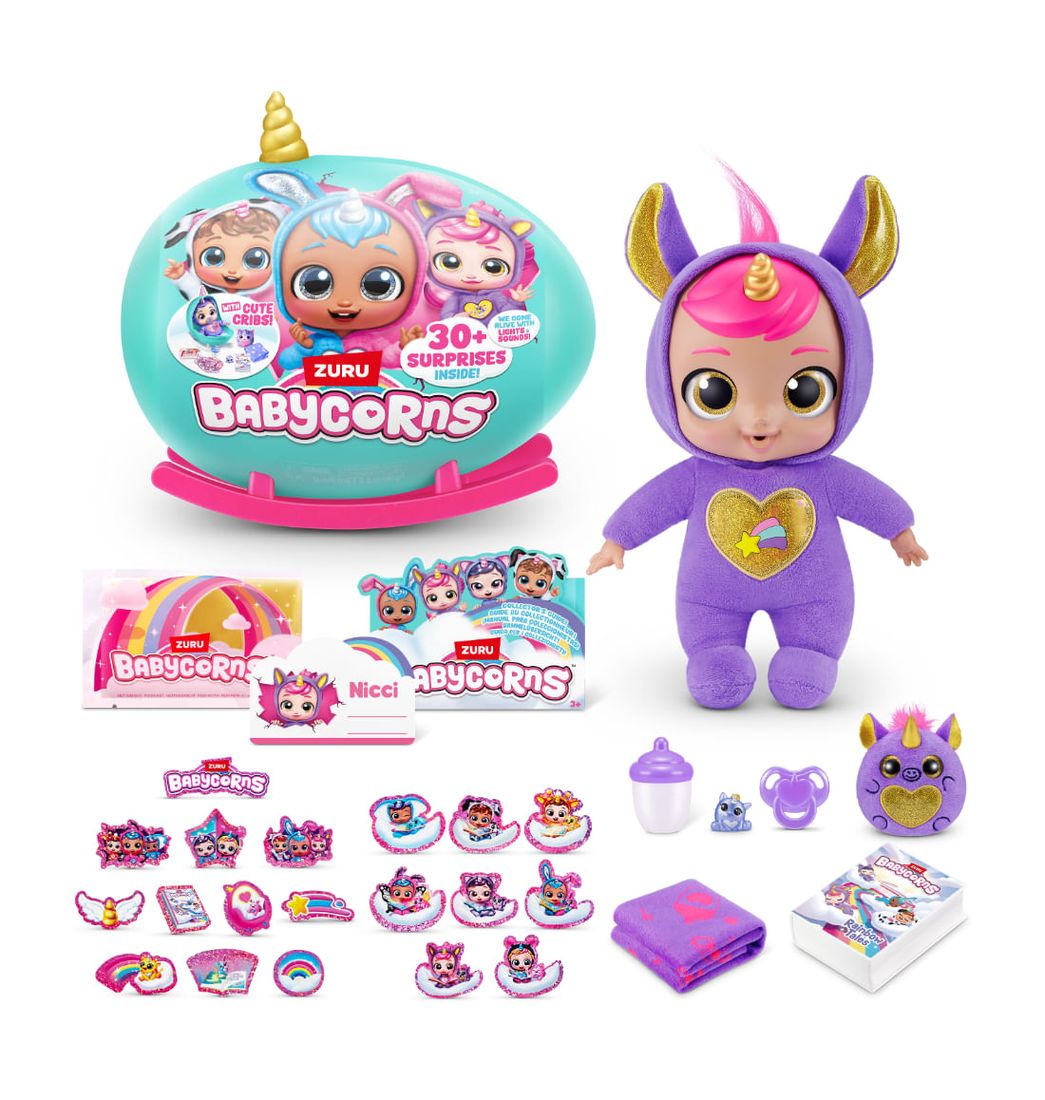 ¡Los Babycorns han llegado para llenar de magia y diversión cada momento! Dentro de cada cuna mágica descubrirás un bebé Rainbocorn interactivo que cobra vida con luces y sonidos encantadores. Con más de 30 sorpresas para explorar, como un chupete, un peluche Boo-boocorn y un conmovedor libro de cuentos, cada Babycorn está listo para ser el centro de tu próxima aventura mágica. Al interactuar con tu Babycorn, ¡este responde con luces y sonidos para un juego más realista y encantador!. Encuentra y colecciona los 4 Babycorns grandes: Poppy, Bibbie, Bowie y Nicci. ¡Cada uno incluye un corazón despegable con una sorpresa especial! Incluye 1 Babycorn grande interactivo, cuna mágica, corazón despegable, Boo-boocorn de peluche, chupete, biberón, mantita, libro de cuentos, tarjeta de biblioteca, slime, 19 pegatinas y guía del coleccionista. Dimensiones: 33 cm (L) x 30 cm (A) x 29,9 cm (H). Pilas: 3 AAA (requeridas - no incluidas).
