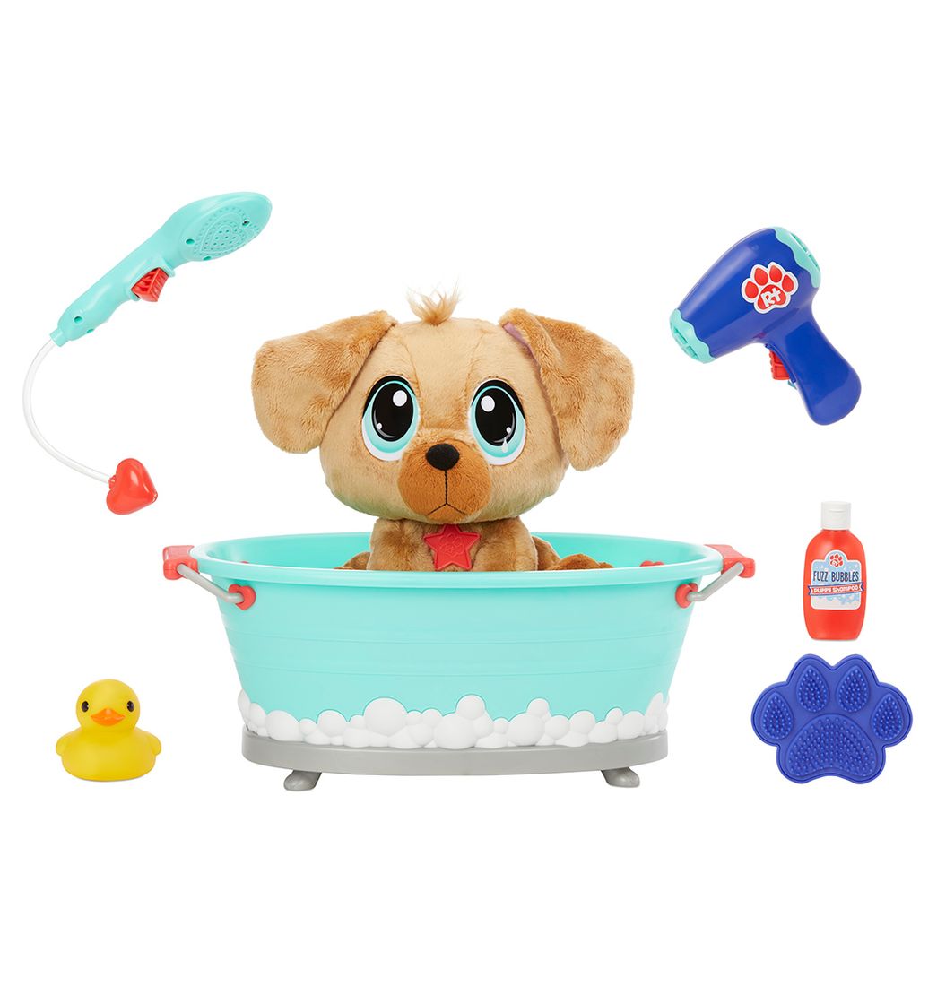 Incluye Golden Retriever, collar, etiqueta de nombre, certificado de adopción, bañera de aseo, botella de champú de simulación, manguera de ducha, cepillo de aseo, secador de pelo y pato de goma.