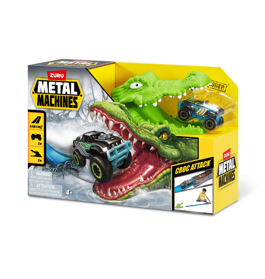 Incluye 1 Máquina de metal, 1 Lanzador potente, 1 Croc, 1 Pista de carreras que incluye rampa de acrobacias.