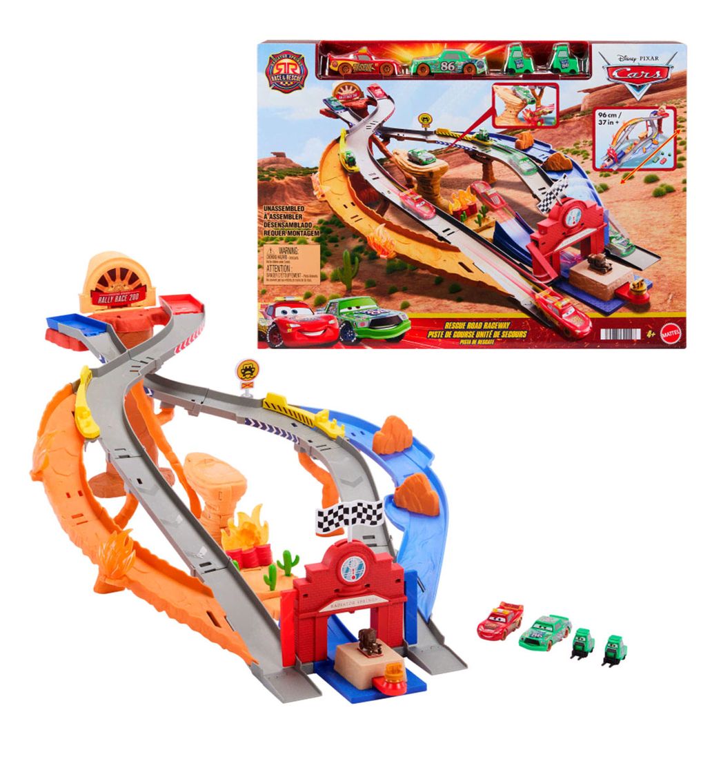 Chick Hicks y sus asistentes del pit están causando todo tipo de estragos en el Rally de Radiador Springs 200, y quién mejor para salvar el día que el mismísimo Rayo McQueen. Hay dos formas de jugar con el set Pista Carrera al Rescate: poner al Rayo McQueen y a Chick Hicks a competir en una carrera o activar el modo de rescate para que el Rayo McQueen despeje la pista y sea el héroe del momento. Este set incluye dos asistentes del pit para mejorar las historias de juego.