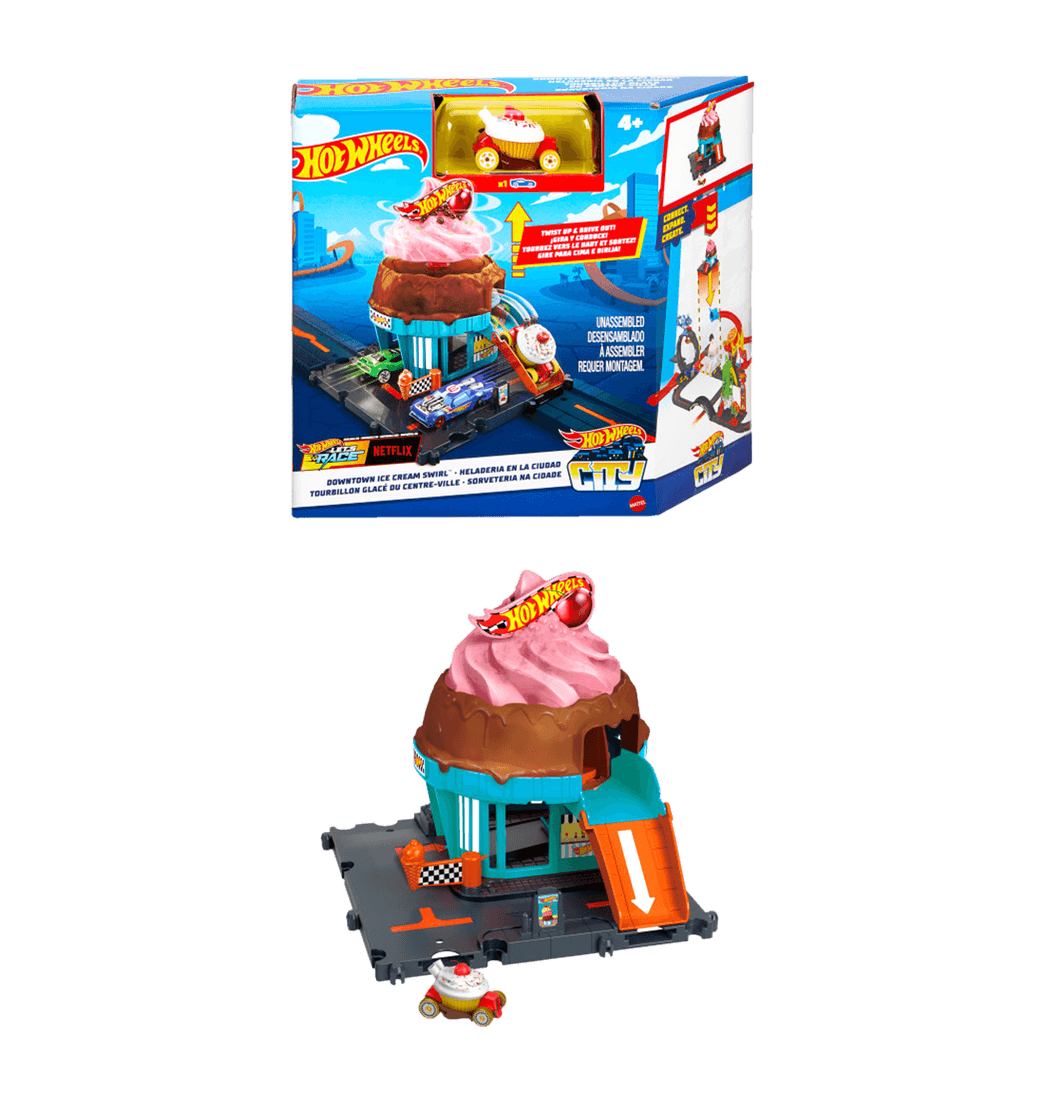 Disfruta a lo grande jugando en la pista con el set de Hot Wheels City Heladería. El set con forma de cono de helado cuenta con un elevador propulsado por un niño que hace girar los autos hacia arriba y a través del helado y hacia la rampa desmontable para vivir más aventuras increíbles. Esta sujeto a disponibilidad. Los colores y las decoraciones pueden variar.