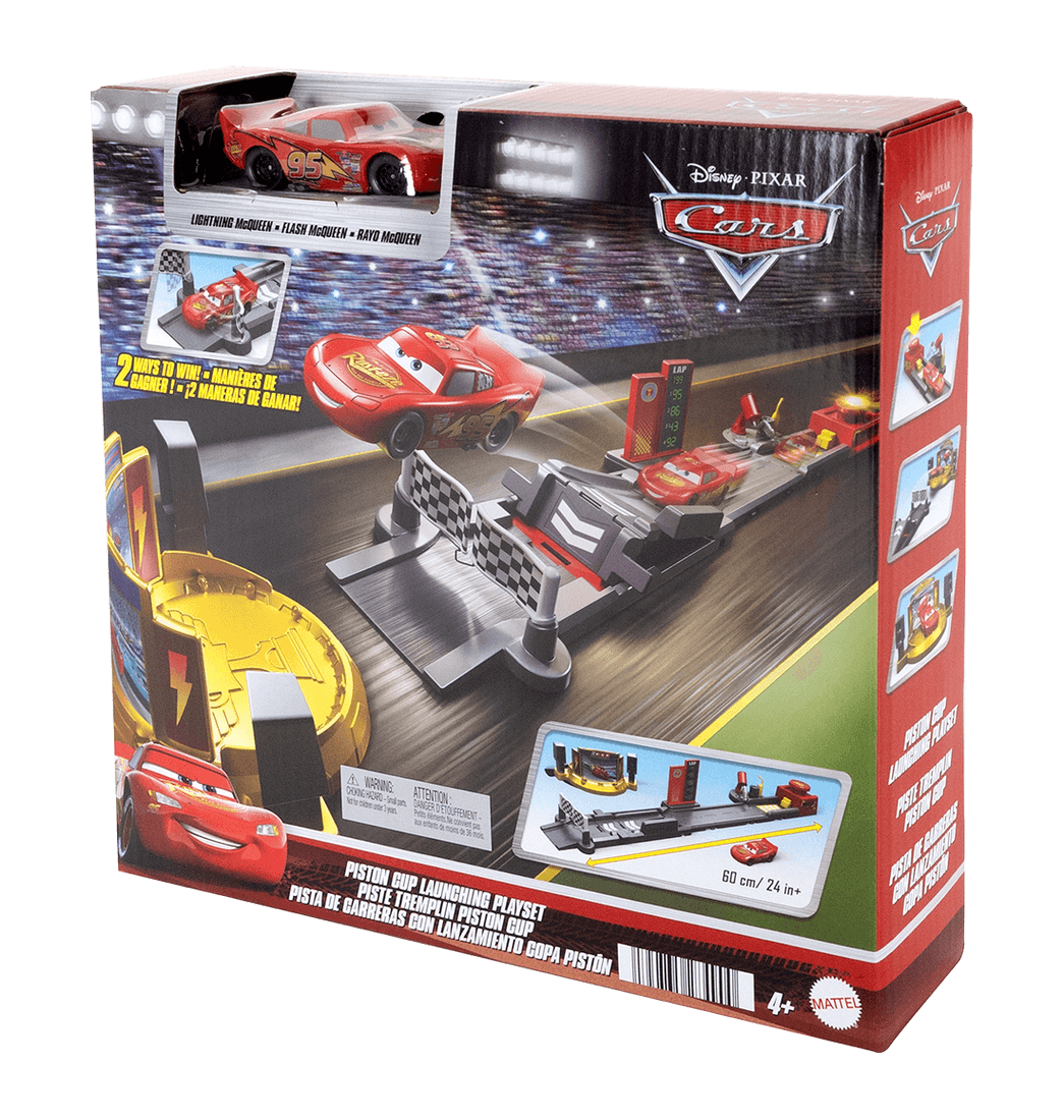 El Rayo McQueen demuestra su velocidad y habilidades acrobáticas en la Pista Lanza y Gana de Cars, que ofrece dos emocionantes maneras de jugar. Comienza en la zona de pits, donde encontrarás accesorios desmontables para preparar a El Rayo McQueen para la carrera. Luego, colócalo en el lanzador y envíalo a toda velocidad por la