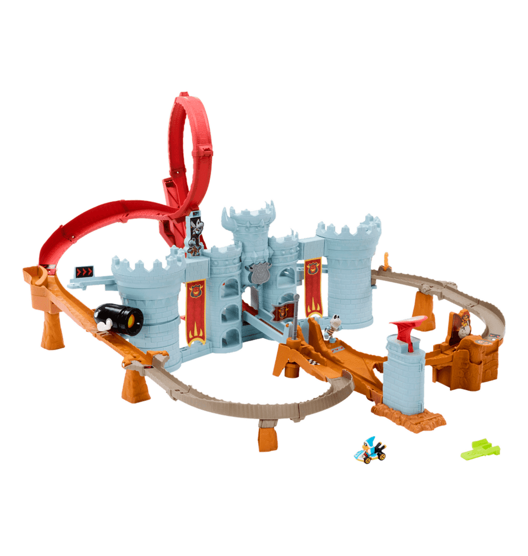 Compite en entusiasmantes carreras llenas de peligro y acción con la pista de juguete Castillo Bowser y el vehículo die-cast incluido de Kamek a escala 1:64, ambos de la línea Hot Wheels Mario Kart.