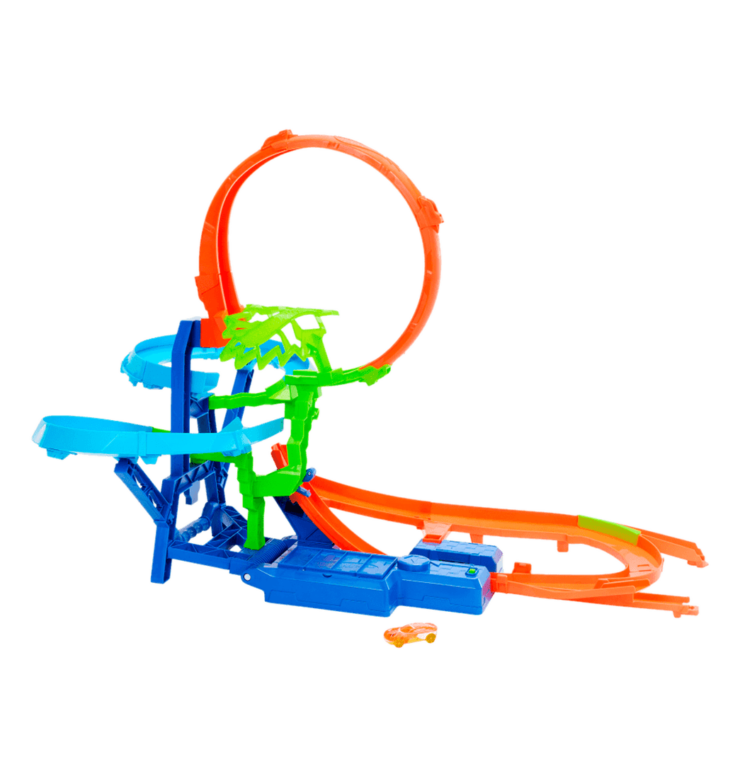 Gira el desviador para salir a toda velocidad hacia nuevos desafíos. Para más diversión, agrega más autos a escala 1:64 para ver en cuánto tiempo se produce un choque en el aire. El set tiene un asa para transportarlo fácilmente.