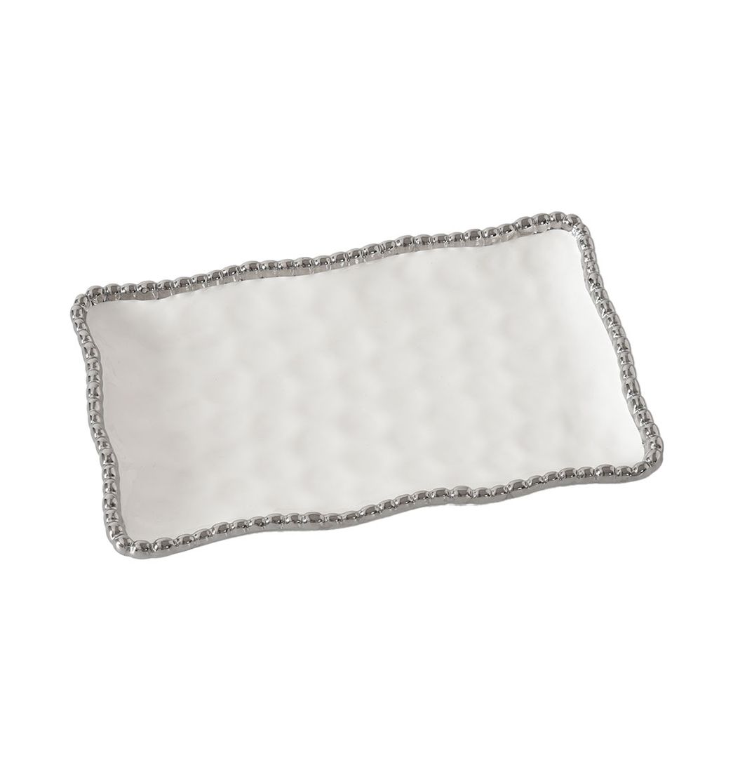 Este plato o bandeja pequeña para servir de la colección Salerno de Oven To Table, esta diseñado para ofrecer una presentación elegante y versátil en cualquier mesa. Fabricado en porcelana de alta cocción con acabado blanco y cuentas plateadas de titanio, esta pieza combina la estética de los muebles metálicos refinados con la practicidad de la cerámica duradera.