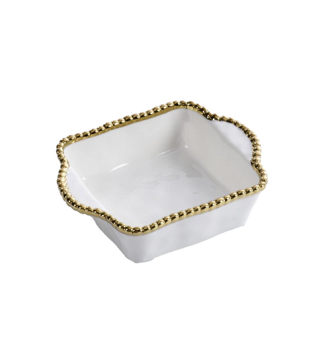 Esta pieza está fabricada en porcelana de alta cocción con un acabado blanco brillante y borde con cuentas plateadas de titanio que evocan el aspecto del metal pulido sin sus inconvenientes.