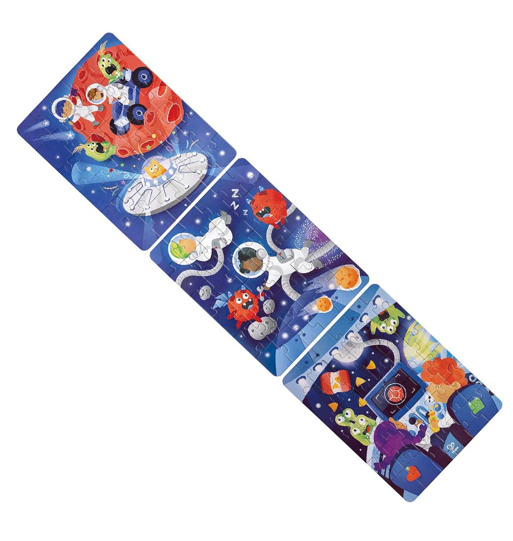 Despega hacia lo desconocido con este rompecabezas infantil de varios paquetes basado en el espacio. Compuesto por 3 rompecabezas separados, puedes armar tu propia historia intergaláctica o también puedes usar los mosaicos de narración adicionales para infinitas variaciones de la historia.