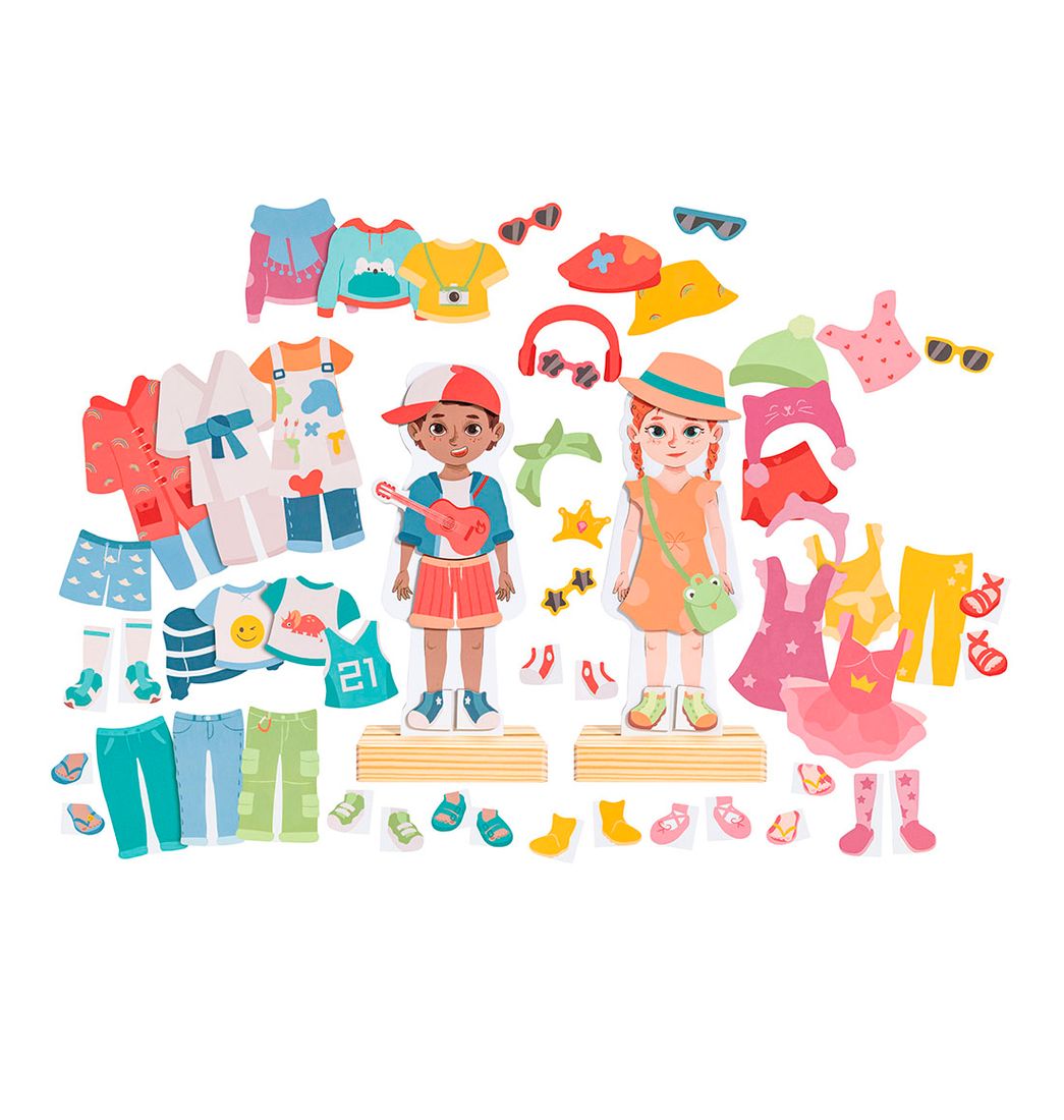 Incluye: 62 piezas magnéticas para vestir, 2 bases de madera, 2 cuerpos de contrachapado.