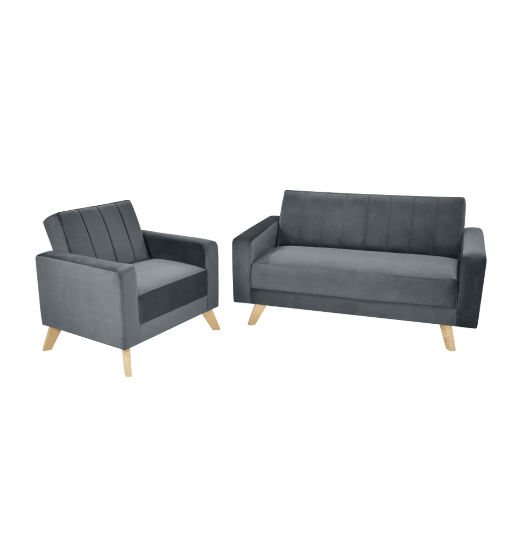 El sofá de 2 puestos y la poltrona Barú con apoya brazos, elaborado en una fuerte estructura de madera pino, relleno en espuma de alta densidad y tapizado en tela poliéster tipo denver velvet con detalle de costuras verticales en el espaldar, en la parte posterior e inferior es tapizado con tela brioni . Cuenta con patas en madera pino color natural. ¡Anímate y adquiérela!