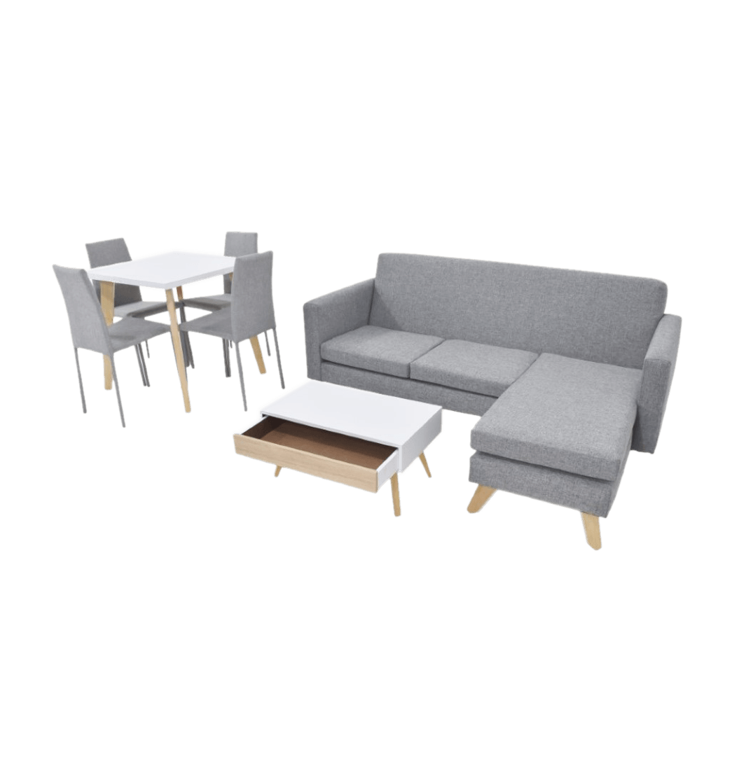 - Incluye: 1 sofá en L, 1 mesa de centro, 1 mesa de comedor y 4 sillas.