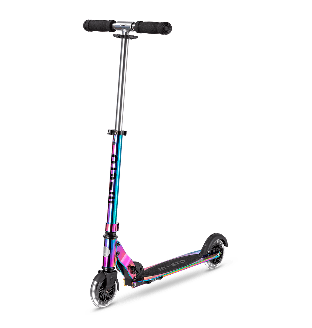 La Micro Sprite Led Neochrome es la evolución de la clásica scooter infantil, ya que cuenta con un diseño atrevido neocromado, resistente, ligero, compacto y plegable, pensado para el uso diario.